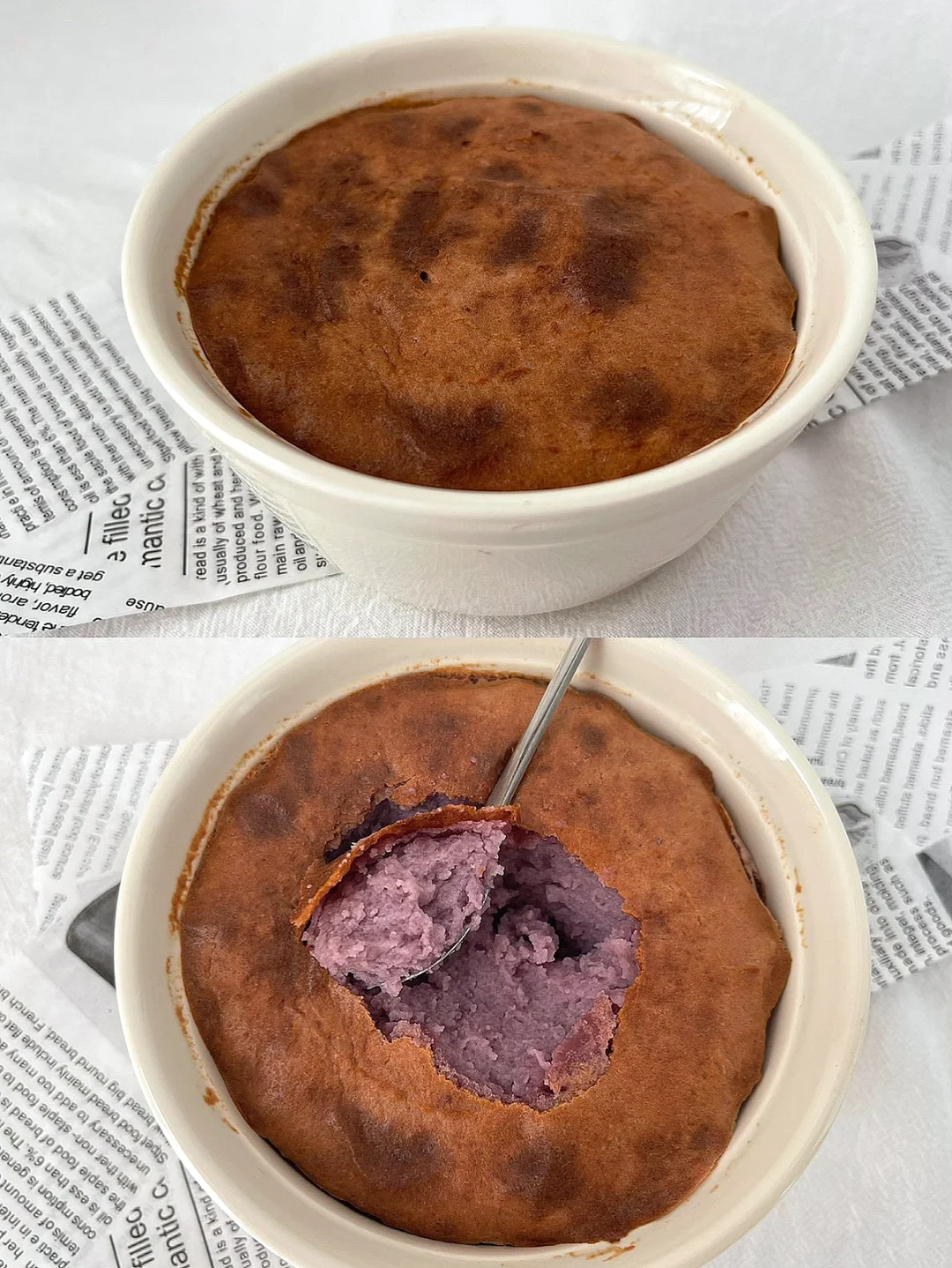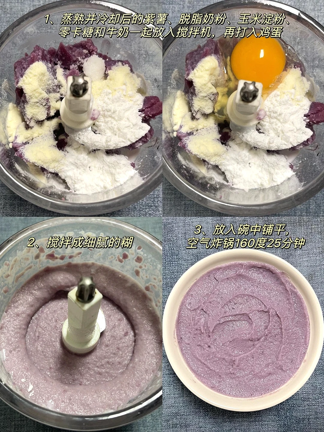 食材:蒸熟的紫薯200g、牛奶110g、玉米淀粉6g、脱脂奶粉10g、鸡蛋1个、零卡糖3g