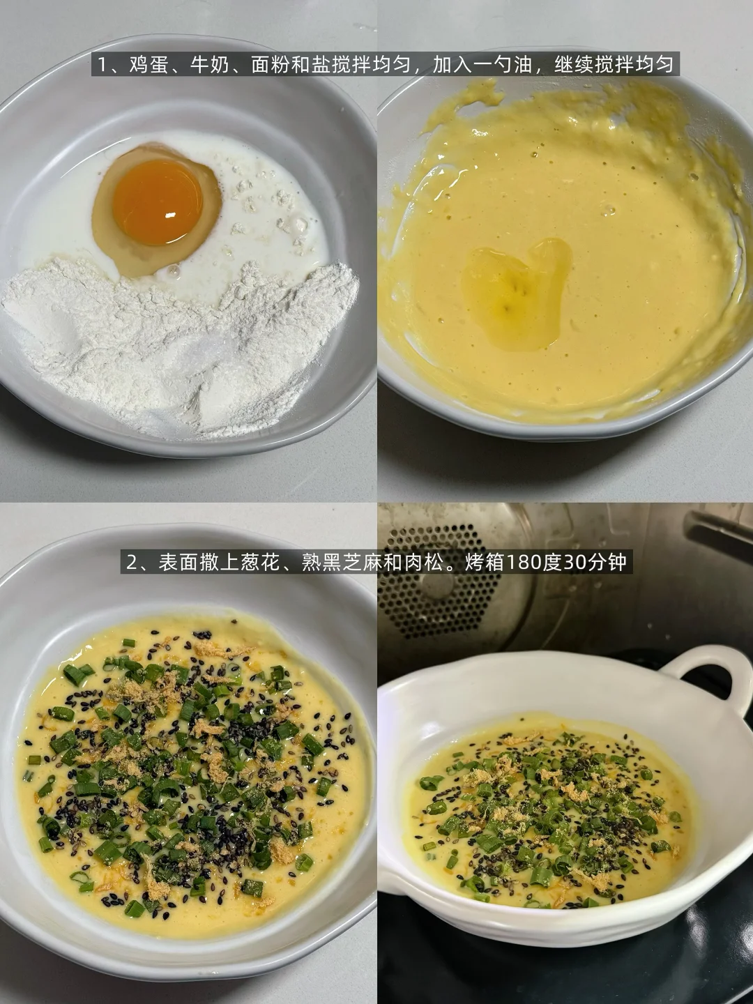 [向右R]食材:鸡蛋1个、面粉30g、牛奶30g、油1勺、葱花、盐,黑芝麻、肉松