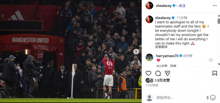 本场比赛第62分钟才登场的曼联小将莱西第87分钟、第90分钟连拿两黄被罚下。其中第90分钟,他因砸球发泄染黄。赛后他也在社媒发文致歉,写道:“我想向我的所有队友、工作人员和球迷们道歉今晚我让大家失望了,我不应该让情绪控制自己。我会尽一切努力来弥补这个错误。”