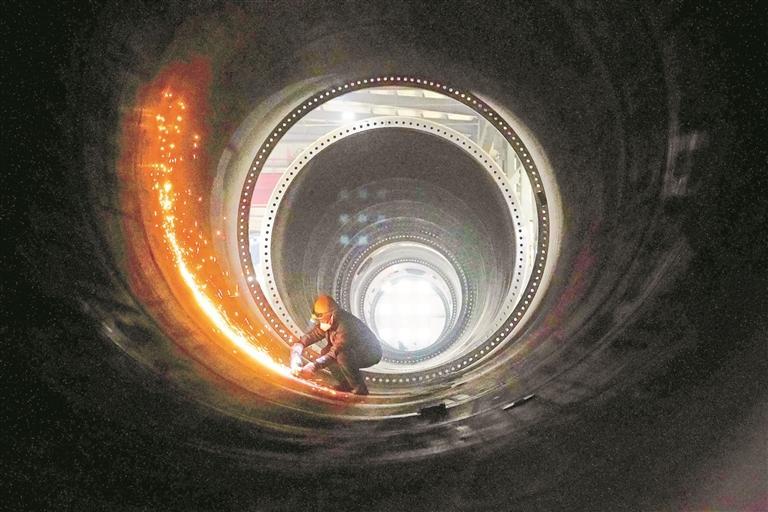 1月11日,贵州威宁经济开发区风电产业园内,贵州保龙设备制造有限公司风电塔筒生产车间,火光闪烁,2条生产线全开,70多名工人赶制订单。“公司现在有3万吨的订单,相当于100多套,预计今年产值超2亿元。”公司副总经理杨敏说,新年伊始,公司风电塔筒的生产就按下了“加速键”。