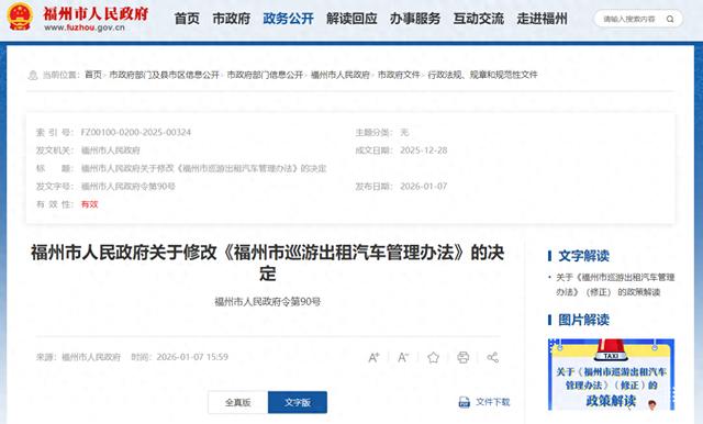 非本市五城区出租车不得从事起讫点均在本市五城区范围内的出租车营运活动;出租车不得从事或者变相从事班线客运……记者获悉,日前,福州公布了福州市人民政府关于修改《福州市巡游出租汽车管理办法》(以下简称“《办法》(修正)”)的决定。《办法》(修正)自2026年2月1日起施行。