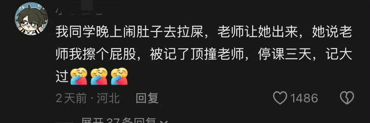 我同学晚上闹肚子去拉屎,老师让她出来,她说老师我擦个屁股,被记了顶撞老师,停课三天,记大过