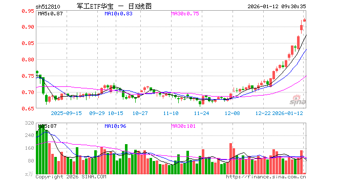 1月12日,军工ETF华宝(512810)开盘涨1.22%,报0.915元。军工ETF华宝(512810)重仓股方面,中国船舶开盘涨0.06%,中航沈飞涨0.96%,光启技术涨4.64%,航发动力涨1.21%,中航光电涨2.78%,中航西飞涨0.63%,中国长城涨1.59%,菲利华跌1.46%,睿创微纳涨1.97%,航天电子涨6.31%。