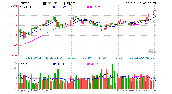 1月12日,科技100ETF(515580)开盘涨0.15%,报1.344元。科技100ETF(515580)重仓股方面,中际旭创开盘跌2.26%,阳光电源跌2.23%,海光信息涨0.00%,宁德时代跌0.33%,恒瑞医药涨0.50%,中兴通讯涨0.22%,京东方A涨0.91%,科大讯飞涨3.42%,海康威视涨0.79%,沪电股份跌0.29%。