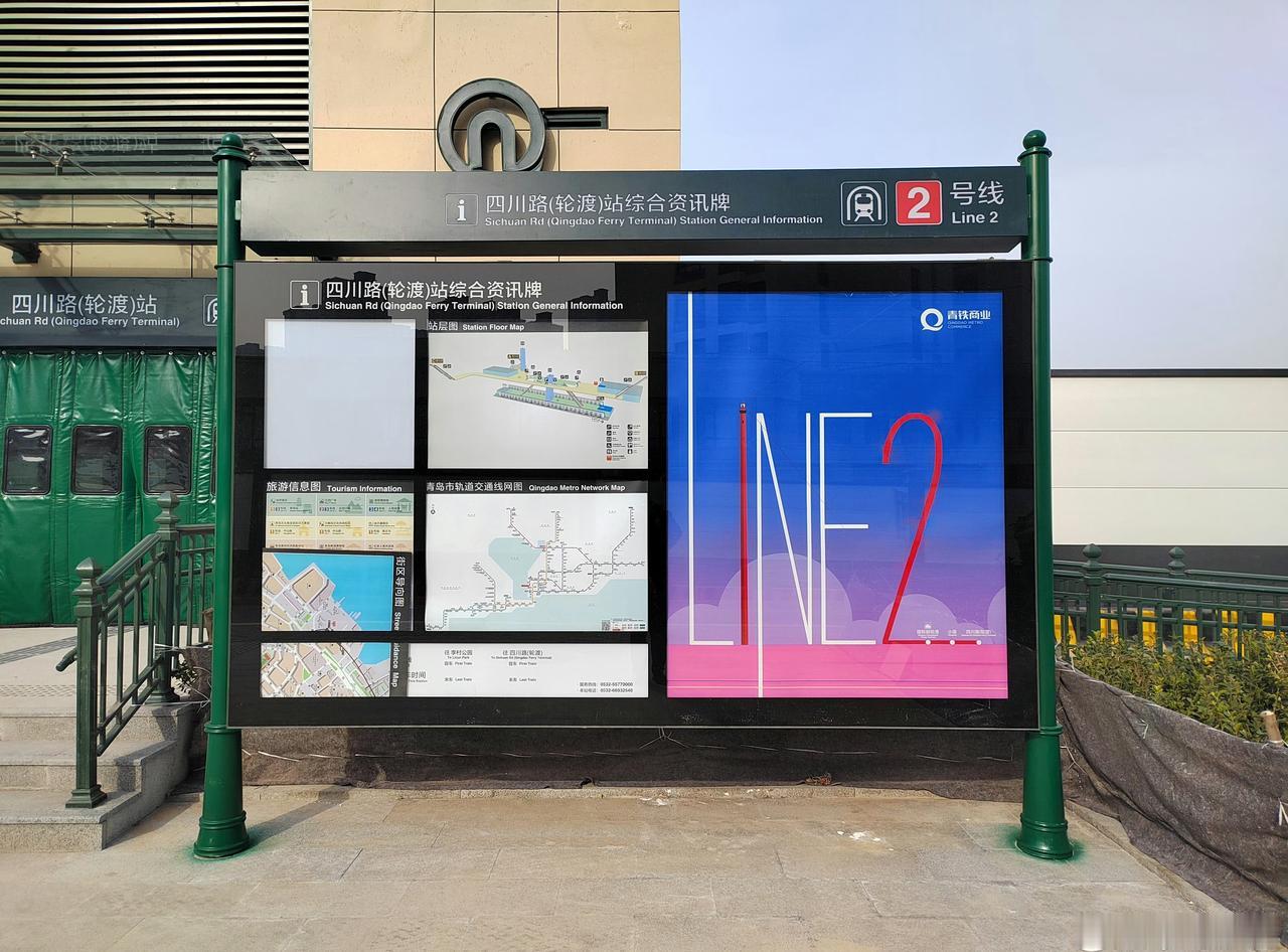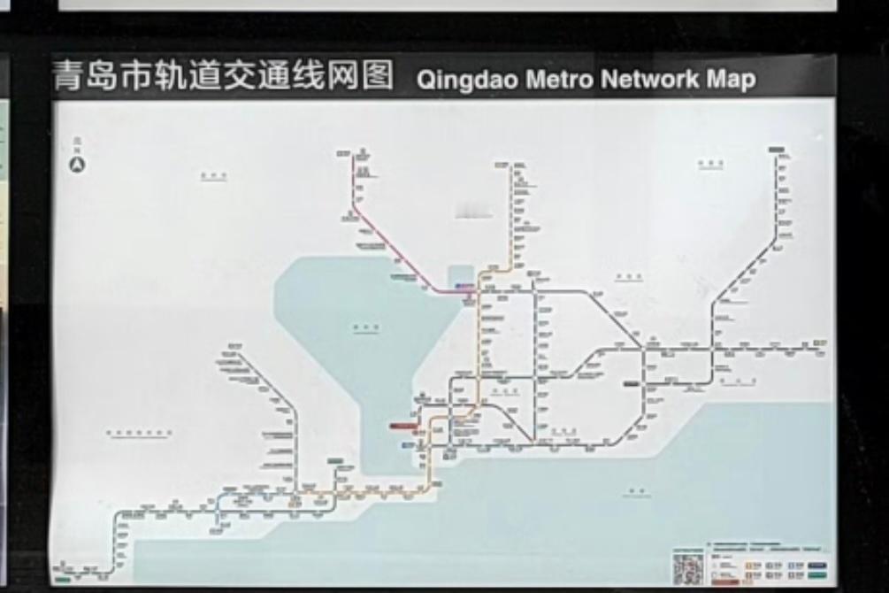 【青岛地铁啄木鸟】𝟓𝟎𝟐𝟗.线网图 综合资讯牌四宫格小标题“青岛市轨道交通线网图”的英文“Metro”应翻译为“Rail Transit”,与中文保持对应,现在的英文是“地铁”而不是“轨道交通”,可在今年新线开通时同步调整 ————————————————————