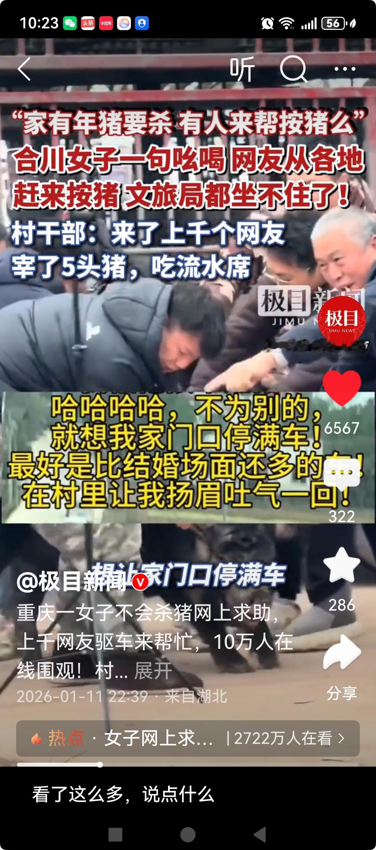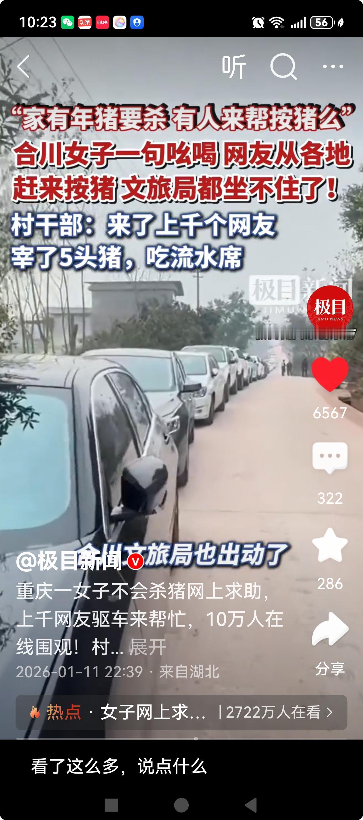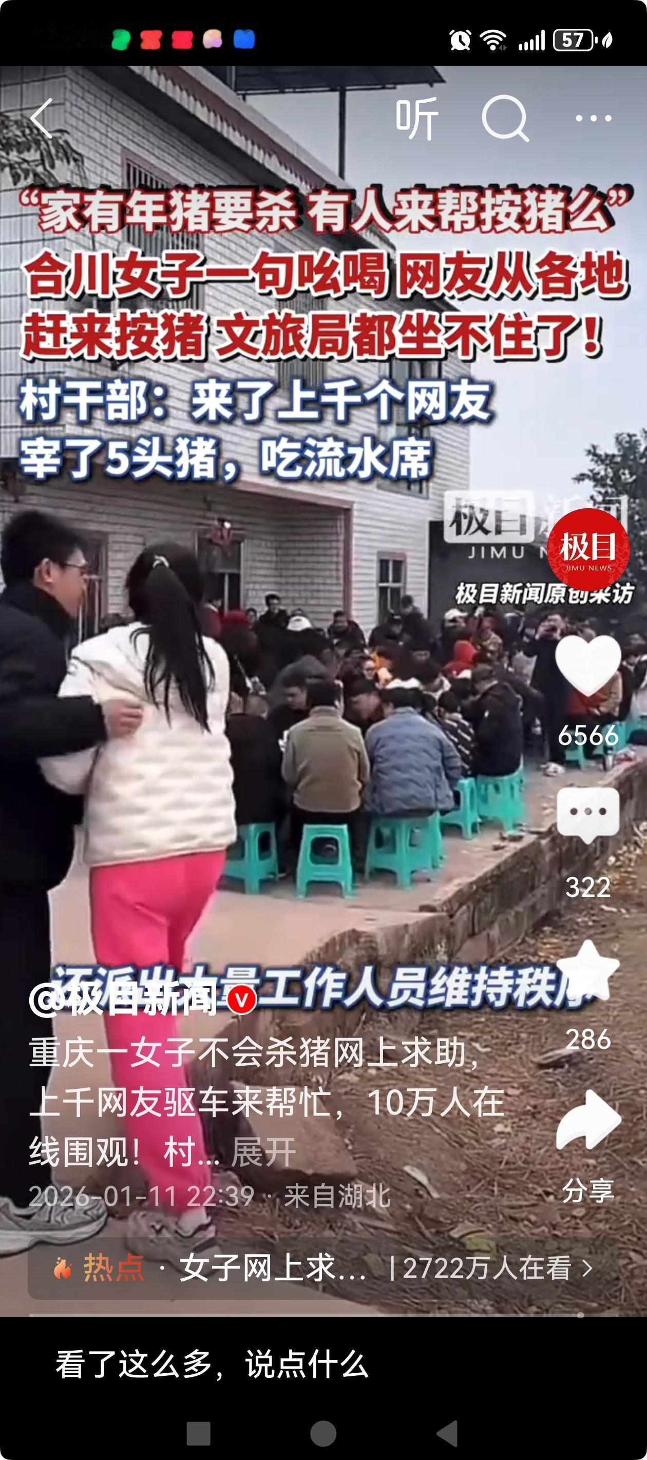 重庆合川的这位女子都怀疑自己是不是“闯祸”了! 据极目新闻报道,近日,重庆合川一名网名为“呆呆”的网友,随手发布了一条抖音视频,称“家有年猪要杀,有人来帮忙按猪吗”, 还说“不为别的,就想我家门口停满车,最好比结婚场面还多的车,在村里让我扬眉吐气一回!”还在评论区发了自家的地址。没想到网友还真圆了她这个梦,上千网友驱车前来帮忙,10万人网上围观。这波泼天的流量让当地文旅部们都坐不住了,趁势推介当地的文旅项目。 不得不说,在这个流量的时代,不乏不甘寂寞的网友,随便的一个话题,就能引发巨量的关注。网友在制造流量的同时,快乐着自己,也感染着他人。只能说是老百姓富足了,有了更多的精力和财力,让自己活的更开心,更快乐。这与其说是网友打卡的狂热,毋宁说是一场全民流量的狂欢。一波流量,不仅能温暖一个小村庄,也能温暖一座城。希望有更多的正能量能够搭上流量的快车,温暖全中国!