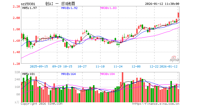 1月12日,截止午间收盘,创业板人工智能ETF华夏(159381)涨5.47%,报2.083元,成交额2.79亿元。创业板人工智能ETF华夏(159381)重仓股方面,中际旭创截止午盘涨0.07%,新易盛跌2.97%,天孚通信涨1.71%,协创数据涨1.24%,软通动力涨6.81%,全志科技涨2.81%,深信服涨8.70%,北京君正涨0.96%,中科创达涨7.84%,景嘉微涨4.28%。