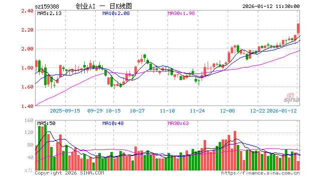 1月12日,截止午间收盘,创业板人工智能ETF国泰(159388)涨5.52%,报2.256元,成交额6313.59万元。创业板人工智能ETF国泰(159388)重仓股方面,中际旭创截止午盘涨0.07%,新易盛跌2.97%,天孚通信涨1.71%,协创数据涨1.24%,软通动力涨6.81%,全志科技涨2.81%,深信服涨8.70%,北京君正涨0.96%,中科创达涨7.84%,景嘉微涨4.28%。