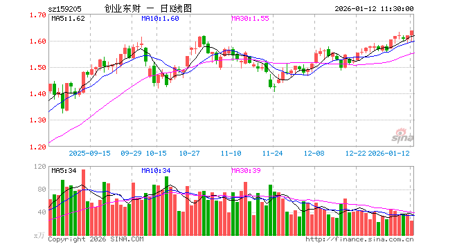 1月12日,截止午间收盘,创业板ETF东财(159205)涨1.05%,报1.636元,成交额4104.38万元。创业板ETF东财(159205)重仓股方面,宁德时代截止午盘跌2.07%,中际旭创涨0.07%,东方财富涨3.15%,新易盛跌2.97%,阳光电源跌3.90%,胜宏科技跌3.05%,汇川技术涨2.94%,迈瑞医疗涨2.20%,亿纬锂能跌1.65%,温氏股份涨0.18%。