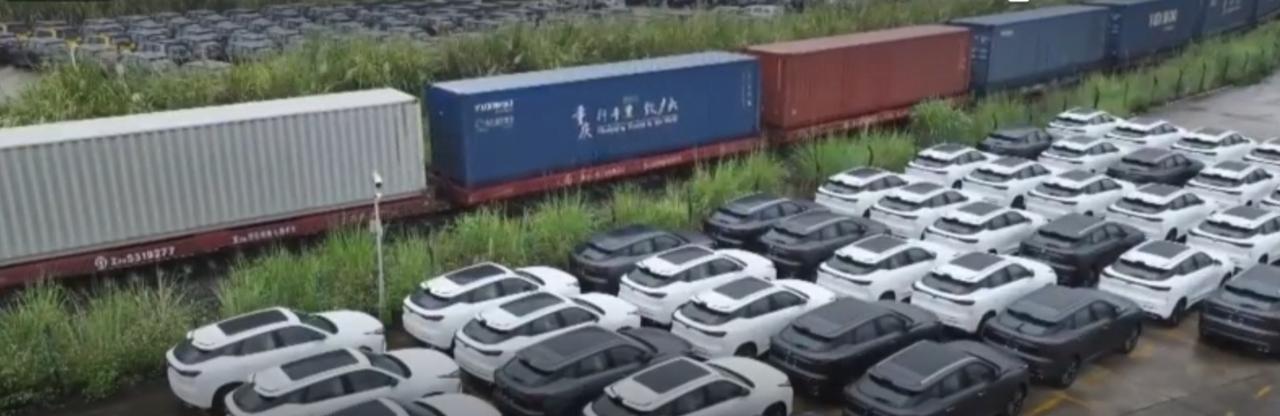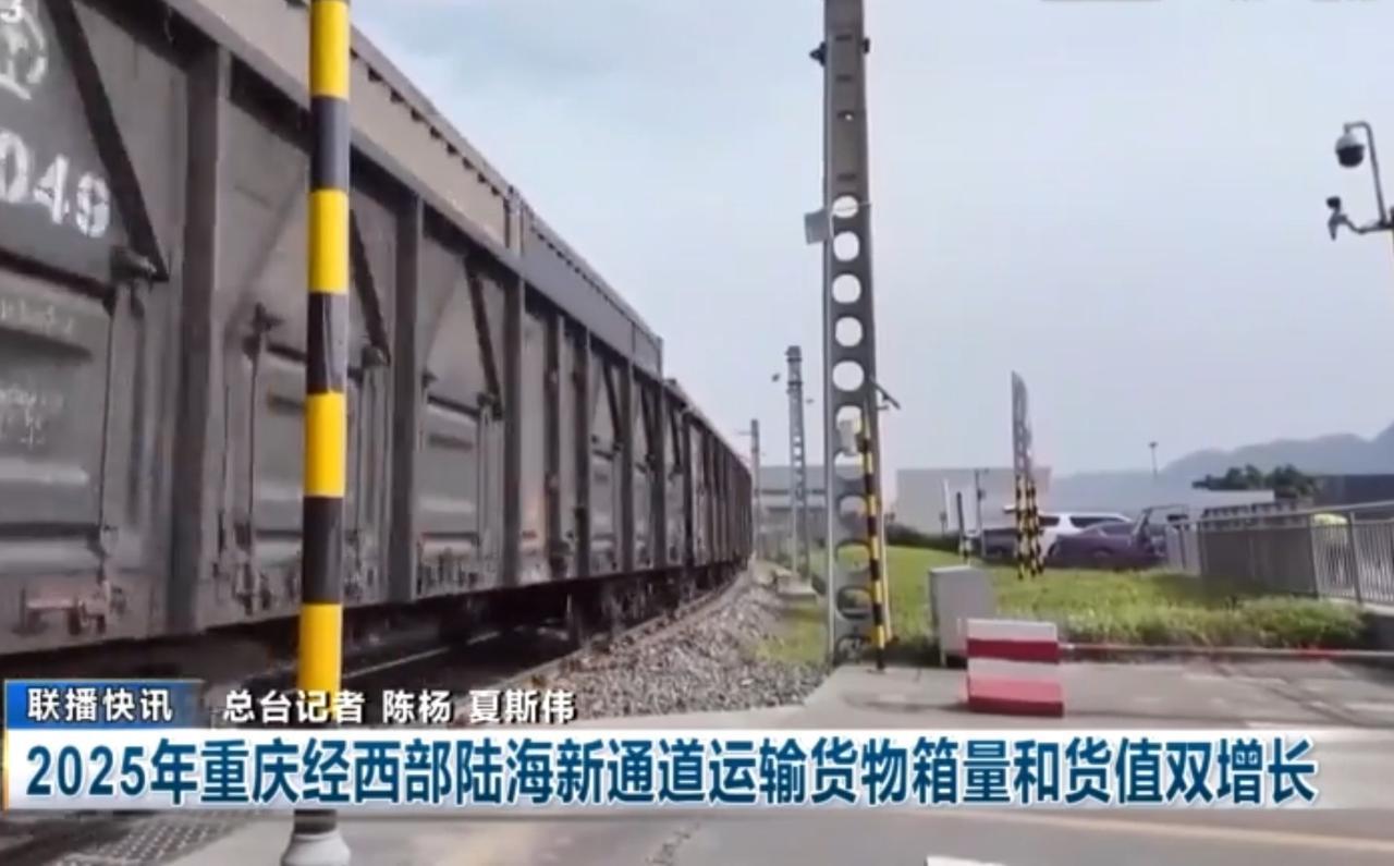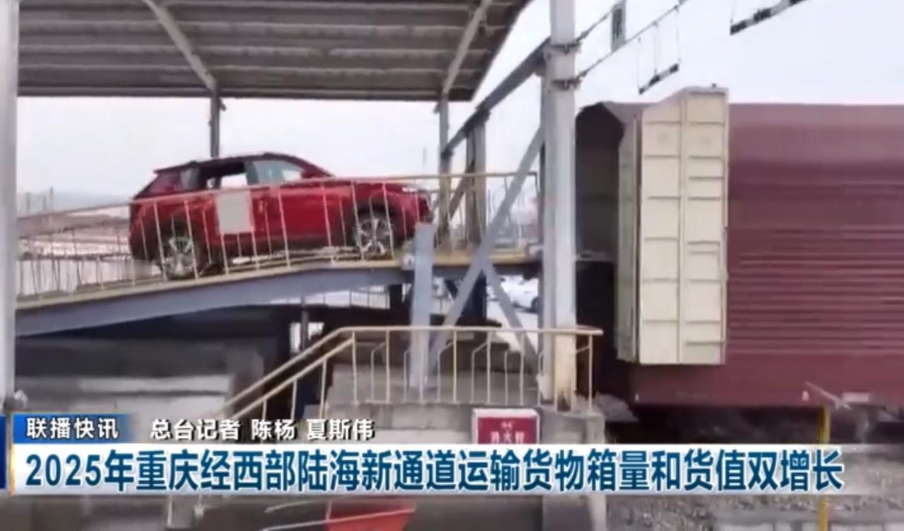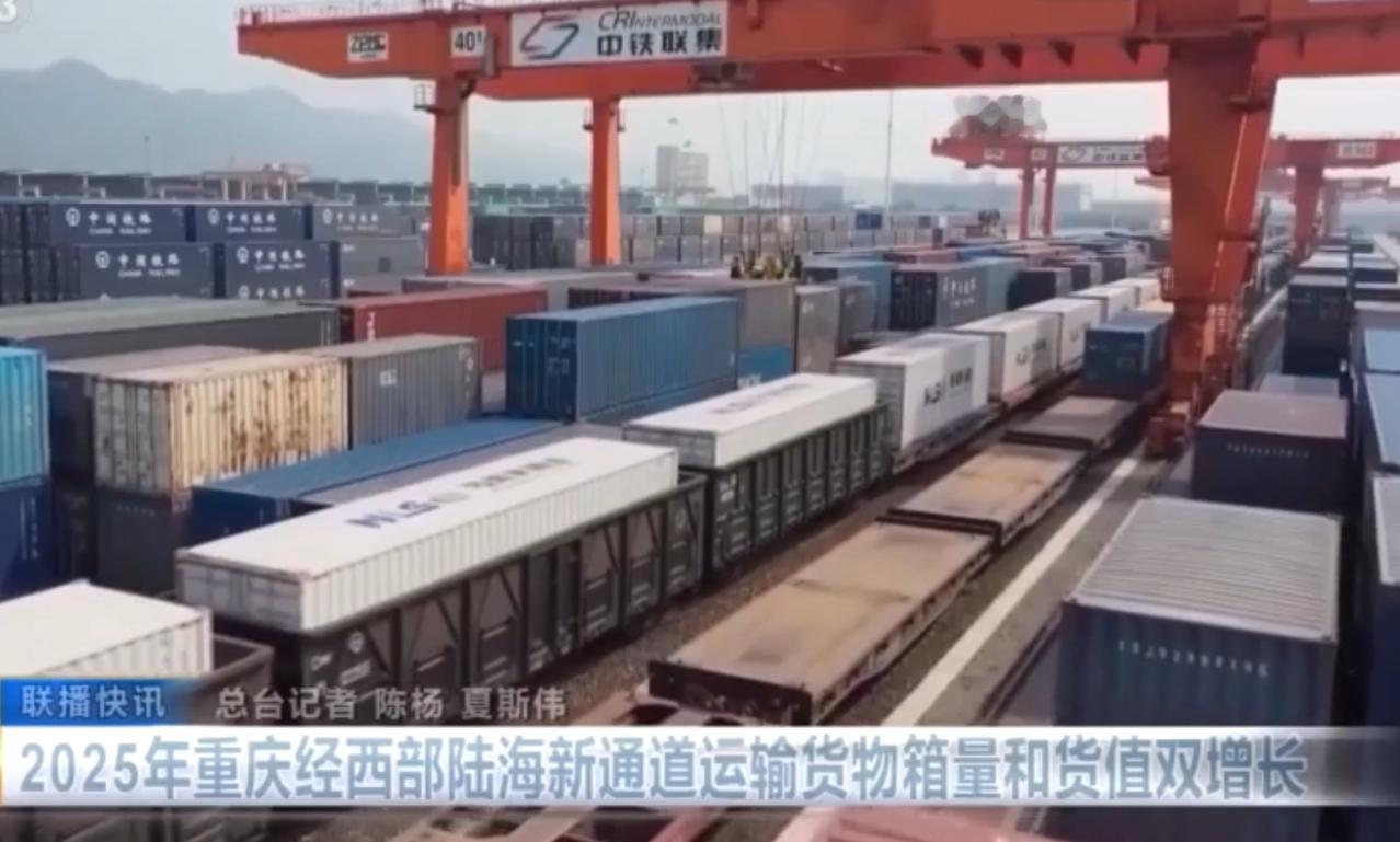 2025年重庆经西部陆海新通道运输的货物实现箱量、货值双增长。画面中,重庆的物流枢纽里集装箱列车整装待发,汽车等货物有序集结、装车,列车一路驶向海外,中铁联集的装卸设备高效运作,展现出西部陆海新通道的物流活力,也体现出重庆依托这一通道,在国际贸易中的运输能力与经济联结力持续提升。
