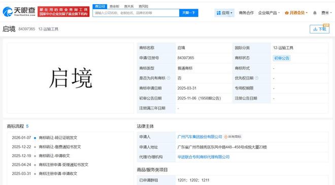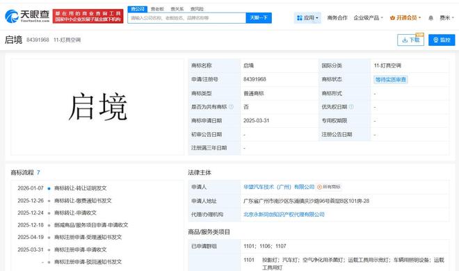 雷达财经讯,天眼查知识产权信息显示,近期,深圳引望智能技术有限公司将多枚“启境”商标转让给华望汽车技术(广州)有限公司,国际分类涉及灯具空调、运输工具、网站服务等,当前商标状态多为等待实质审查。