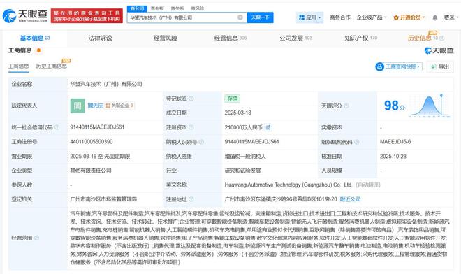 华望汽车技术(广州)有限公司成立于2025年3月,法定代表人为閤先庆,经营范围包括汽车销售、汽车零部件及配件制造、汽车零配件批发等。股东信息显示,该公司由广汽集团(601238)、广汽埃安新能源汽车股份有限公司共同持股。
