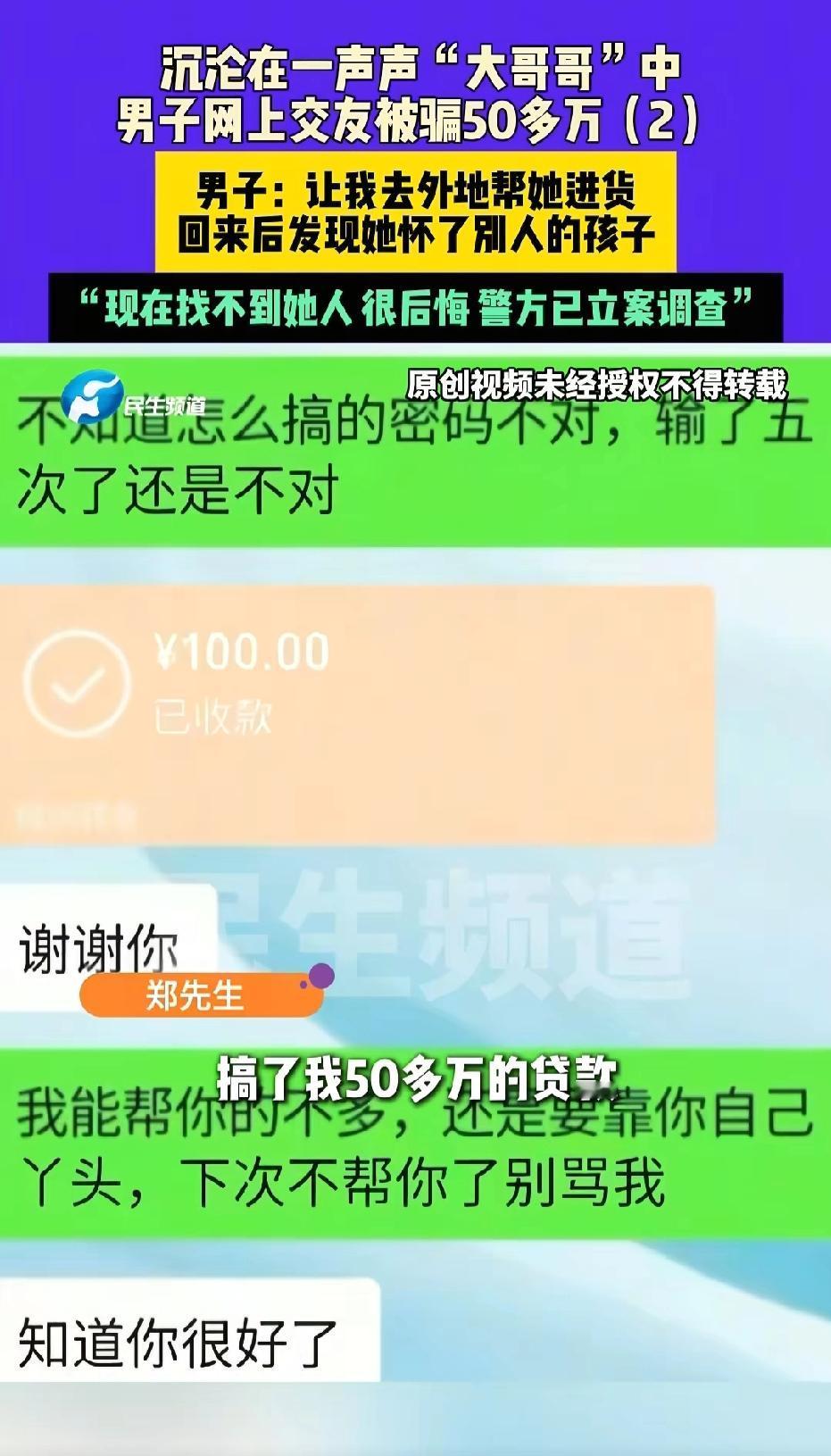 内蒙古,41岁男子网上认识一个女子,女子天天称呼他“大哥哥”,要跟他处对象,男子入迷了,以为两人有戏,他贷款55多万,给女子拿去做生意,帮付前男友分手费。甚至愿意为女子去外地收水果。不料,9个月后,男子回来,却发现女子又怀孕了,男子称,不知道孩子是谁的,自己被骗得好惨。 2025年1月11日,郑先生向记者求助,他网恋的女友向他写553418元欠款,几个月后都没有还,人也失踪了。 郑先生今年41岁,还是孑然一身。现实中没有机会遇到另一半,他就把目光放在了网上。 偶然的机会,郑先生刷到了一个视频。 女子哭诉称,自己独自生产,被前男友抛弃,只能带着宝宝孤零零待在医院。 郑先生告诉记者,他当时看到这个视频,感觉女子好可怜,她还独自带着孩子。 郑先生同情心泛滥,于是跟女子聊几句安慰的话。 女子看到郑先生,就好像看到了救命稻草。 她一声声“大哥哥”喊得郑先生晕乎乎的。 女子说自己没钱吃饭,让郑先生帮她叫外卖。 郑先生毫不犹豫同意了。 接下来发生的事情更是出乎他的预料意料之外。 没过多久,女子跟郑先生表示,要跟他处男女朋友关系。 郑先生头脑一热,以为自己做善事得到了回应,心里那个美呀。 不料,女子却说,自己得和本地前男友分手,对方要分手费5万。只有和前男友断干净,才能安心和郑先生过日子,让他先垫上。 郑先生也是头脑一热,真的给垫上了。 从线上走到线下,郑先生彻底被女友拿捏。 女友说孩子需要奶粉钱,又说独自带娃太累,请保姆需要开支,他也二话不说掏钱。 后来女友又提出要创业,想开两家奶茶店和一家水果店,还说要以加盟的方式装修。 郑先生粗略一算,这得花几十万,可他手头没这么多钱。 为了博女友欢心,他咬牙去银行贷了55多万,光是装修和买家具就砸进去30万。 他满心以为,自己掏心掏肺的付出,能换来女友的死心塌地。 然而,他想错了。 女友让他去新疆,说那里水果需要有人打理。让郑先生过去帮忙,还承诺等生意稳定,两人就好好过日子。 被爱情冲昏头脑的郑先生,二话不说奔赴新疆,这一去就是9个月。 不料,9个月后,等他回来却发现,网恋女友又怀孕了。 但孩子他爹不是他。郑先生好像被一棍子打醒,自己上当受骗了。 于是他报警,等警察调查真相后,郑先生发现,女友说的开两家奶茶店也是假的,他崩溃了。 女友当着警察的面,给郑先生写了一张欠条,欠他553418元,上面写了某年某月还清。 但事情过去了好几个月,女友也跑了,电话也不接,郑先生一分钱也没收到。 无奈之下,他只能找到记者曝光。 记者试着打电话给女子,没打通,最后联系上了女子的弟弟。 不料女子的弟弟也说,他也被骗钱了,要是找到她就好办了。 目前,郑先生很后悔,轻易给钱给对方,他已经报警,警方已经立案。 一句大哥哥骗走55万,这女子太可恨了!希望警方早日破案,帮大哥追回损失。 连亲弟弟都骗,这女子太离谱了! 最后提醒大家,网恋加上投资等于高风险!别被爱情冲昏了头脑。 《刑法》第224条规定,以非法占有为目的,在签订、履行合同过程中,采取虚构事实或者隐瞒真相等欺骗手段,骗取对方当事人数额较大的财物的行为 ,构成合同诈骗。 女子编造不存在的奶茶店、水果店加盟项目,属于典型的“虚构经营项目”,符合合同诈骗的核心特征。 她未将55万余元用于所谓创业,而是用于个人开销,且在骗局败露后失联,完全无履行合同的诚意和行为。 个人合同诈骗数额在20万元以上属于“数额巨大”。 55万余元已远超该标准,若罪名成立,女子将面临3至10年有期徒刑,并处罚金 。 同时,郑先生手中的欠条可作为关键证据,辅助证明款项性质与诈骗事实,后续可通过刑事附带民事诉讼或单独民事诉讼追偿损失。 对此,你怎么看?