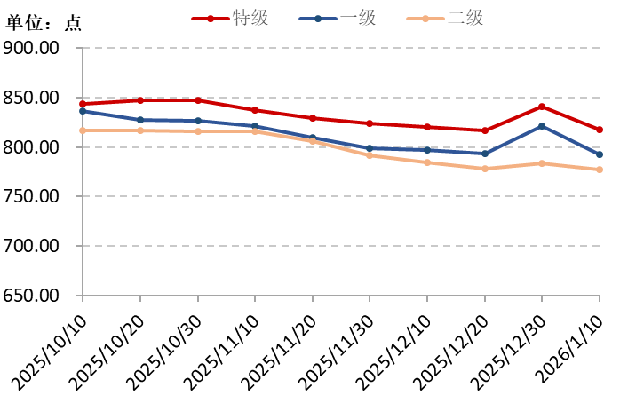 从质量等级维度来看,截至1月10日,特级花椒价格指数报817.88点,较上期下跌2.75%,较基期下跌18.21%;一级花椒价格指数报792.88点,较上期下跌3.46%,较基期下跌20.71%;二级花椒价格指数报777.65点,较上期下跌0.76%,较基期下跌22.23%。