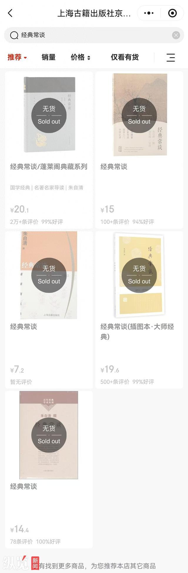 1月12日,记者通过电商平台查询发现,上海古籍出版社在京东自营店的五个不同版本《经典常谈》均已显示无货;其淘宝旗舰店同样搜索不到该商品。在淘宝北京出版集团旗舰店,仅能查到相关丛书套装,并无《经典常谈》单本。记者联系店铺客服,工作人员回复称,《经典常谈》单本已下架无货。