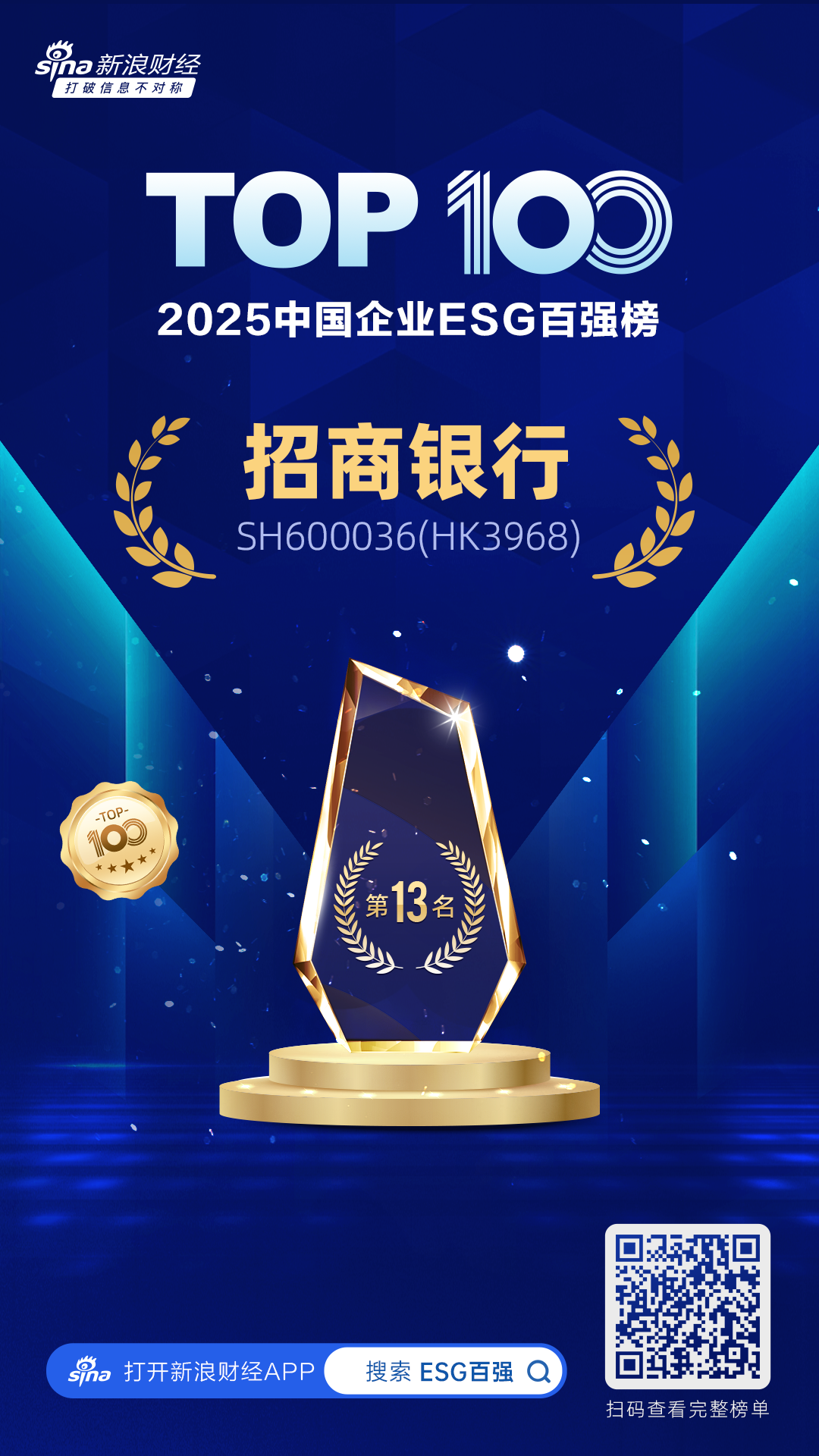 招商银行在环境、社会、公司治理领域开展了大量工作,积累了丰富的创新实践与扎实的落地成果。凭借在ESG各领域的卓越表现,招商银行成功入选本次新浪财经“2025中国企业ESG百强”榜单,并位列第13名。