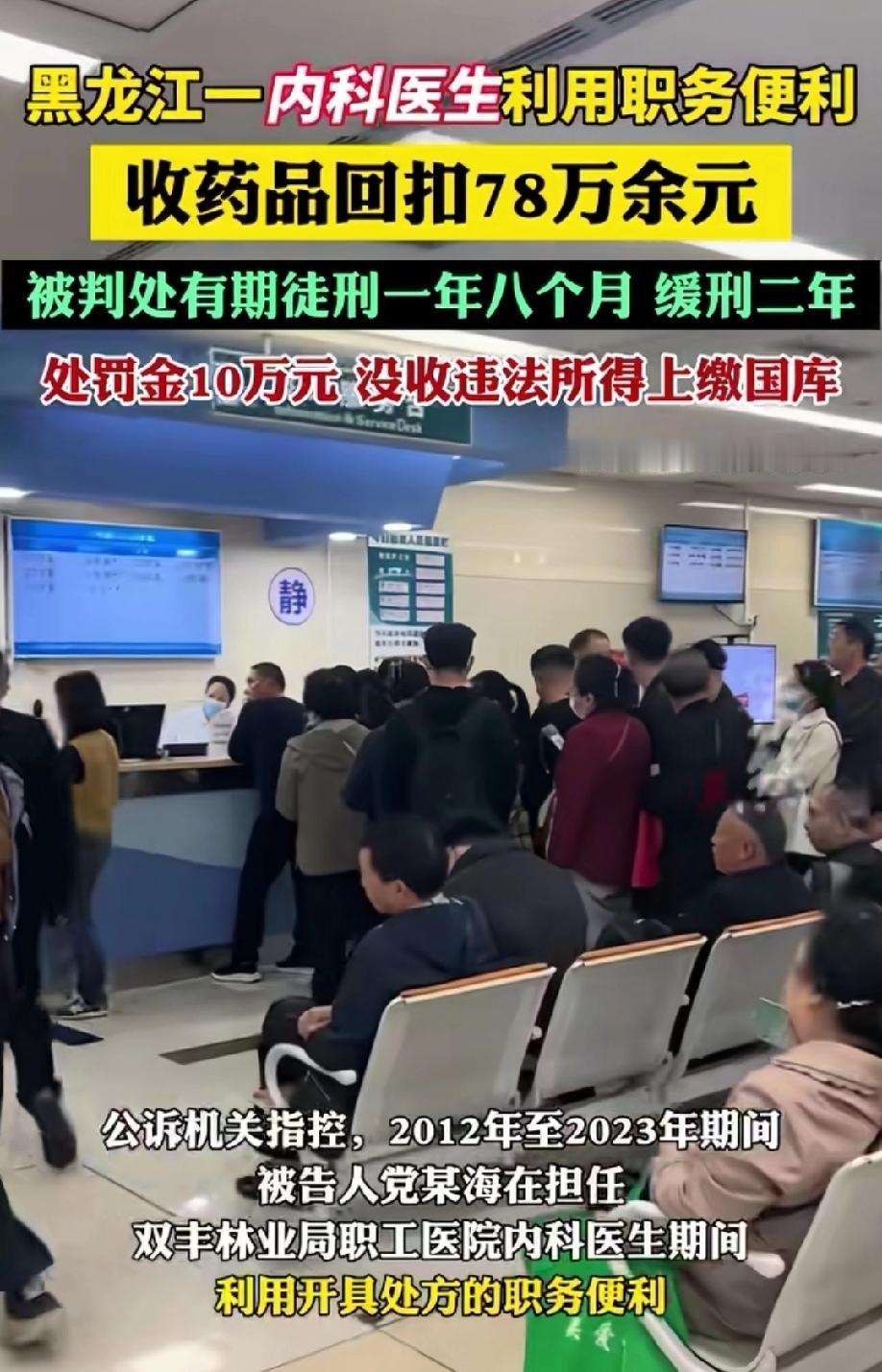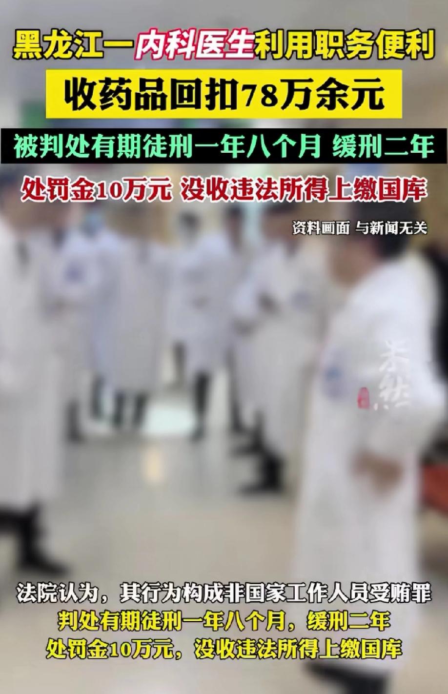 黑龙江,男子是某医院内科医生,他用自己可以开处方的权力,通过开具药品处方,收受多家医药公司的回扣,十余年时间,男子共计获取违法所得78.91万元。本以为一切都天衣无缝,殊不知天下没有不透风的墙,东窗事发后,男子违法所得的78.91万被没收,还被判处有期徒刑一年八个月,并处罚金10万。 男子党某是一名内科医生,手握处方大权却不走正途,借着给患者开药的便利,偷偷收受医药公司的回扣,这一收就是十一年。 本以为这笔“灰色收入”能神不知鬼不觉,没想到最终还是东窗事发,不仅非法所得的78万余元被全部没收,还背上了牢狱之灾。 2012年,党某已经在当地一家医院的内科工作多年,凭借丰富的临床经验,成了科室里能独当一面的医生。 看似事业风生水起,党某手里的处方权也成了医药公司眼里的“香饽饽”,他也慢慢有点飘了。 起初,有医药公司的业务员找他谈,承诺只要多开他们公司的药品,就能按销售额给一定比例的回扣。 刚开始党某还有些犹豫,觉得这么做违背医德,可看着业务员递过来的“好处费”,想到能轻松多一笔收入,他的防线慢慢松动了。 党某认为,他就开个药而已,开哪个要不是开,而且别人也不知道,多赚点钱改善生活也没什么,抱着这样的侥幸心理,党某迈出了第一步。 一旦开了头,贪婪的口子就再也收不住了。 党某开始有针对性地给患者开具特定医药公司的药品,不管是疗效相近的常用药,还是价格偏高的新药,只要有回扣可拿,他都优先推荐。 而医药公司的业务员也很“上道”,定期会把回扣款送到他手里,有时是现金,有时是通过隐蔽的方式转账,双方心照不宣。 为了不被发现,党某格外小心,收好处费也都选在没人的地方,平时在同事和患者面前,依然装出一副严谨负责的样子。 看着银行账户里慢慢增多的存款,他心里既窃喜又忐忑,可每次收到回扣时的满足感,都让他把风险抛到了脑后。 这一收就是十一年,从2012年到2023年,党某先后和多家医药公司的业务员、销售经理达成默契,收受的回扣款一笔接一笔,累计下来竟然有789110元。 党某甚至盘算着,再干几年就退休,拿着这笔钱安享晚年,觉得自己做得天衣无缝。 可天下没有不透风的墙,相关部门在排查医药购销领域利益输送问题时,发现了多家医药公司的异常资金流向,顺着线索一路追查,最终将矛头指向了党某。 当办案人员找到党某时,他还试图狡辩,但在确凿的证据面前,他的谎言不堪一击。 看着自己多年来的“秘密”被彻底揭开,党某瞬间瘫软下来,知道自己的好日子到头了。 公诉机关认为,党某作为医院工作人员,利用开具处方的职务便利,非法收受医药公司回扣款,为他人谋取利益,数额较大,其行为已经构成了非国家工作人员受贿罪。 《刑法》第一百六十三条规定:公司、企业或者其他单位的工作人员,利用职务上的便利,索取他人财物或者非法收受他人财物,为他人谋取利益,数额较大的,处三年以下有期徒刑或者拘役,并处罚金……。 本案中,党某作为医院内科医生,属于“其他单位的工作人员”,其处方权是职务便利的核心体现。 2012-2023年间,他非法收受医药公司回扣款78.91万元,为对方优先用药,符合“为他人谋取利益”的要件,且数额远超3万元的立案标准,构成非国家工作人员受贿罪。 《刑法》第六十四条规定:犯罪分子违法所得的一切财物,应当予以追缴或者责令退赔;对被害人的合法财产,应当及时返还;违禁品和供犯罪所用的本人财物,应当予以没收。没收的财物和罚金,一律上缴国库,不得挪用和自行处理。 党某收受的78.91万元回扣款属于犯罪所得,依法应予没收并上缴国库。 综上,法院考虑到党某到案后如实供述自己的罪行,自愿认罪认罚,最终作出判决:判处党某有期徒刑一年八个月,缓刑二年,并处罚金10万元。 党某违法所得的789110元全部予以没收,上缴国库。 党某因为一时贪念,不仅背负案底,还让他失去了医生的职业资格,更让多年积累的口碑毁于一旦。