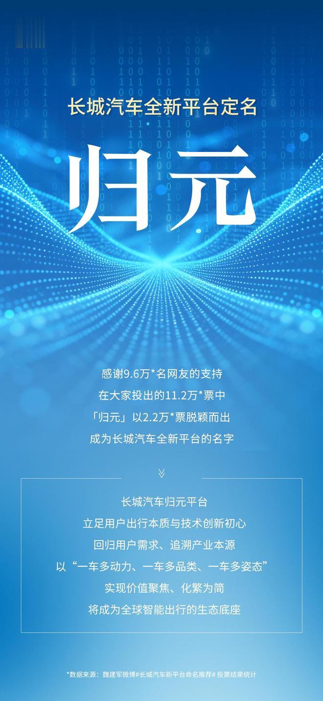 IT之家1月12日消息,长城汽车董事长魏建军今日宣布,将于1月16日发布全新平台——归元平台。在此前的命名投票中,“归元”以2.2万票脱颖而出。