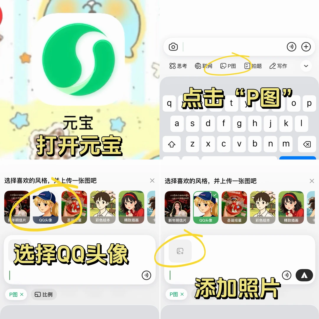 除了古早QQ头像,元宝还有好多专属P图模板,萌趣手绘,治愈日漫什么的!(o^^o)