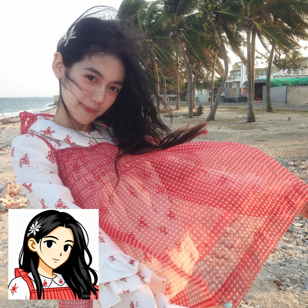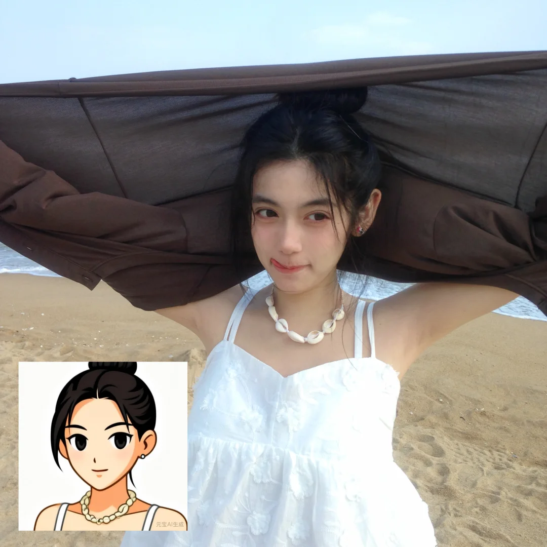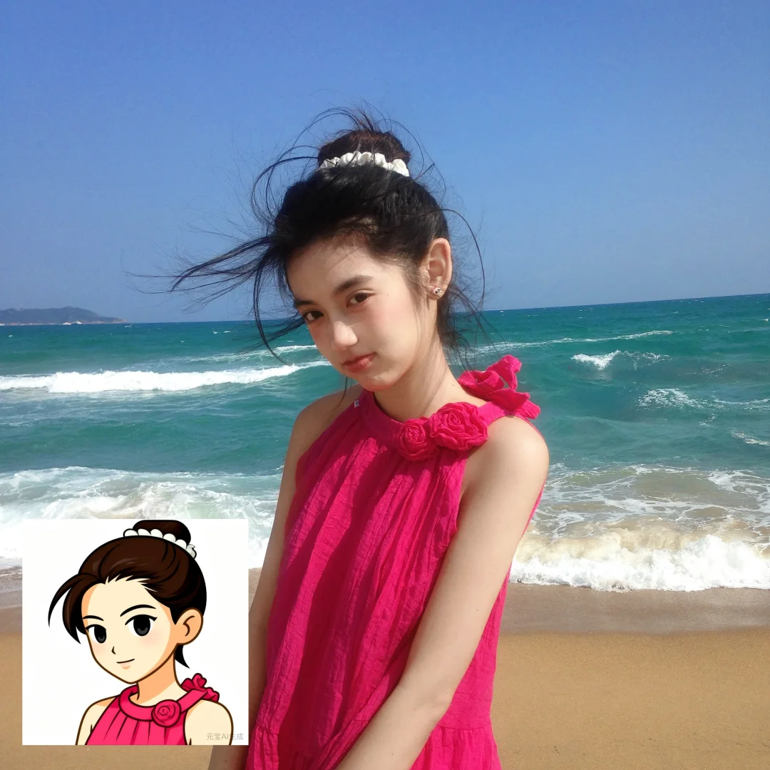 用元宝根据海边照片的风格生成的,操作超简单,上传照片就能一键出图,连细节都拿捏住了,头上的发夹、飘逸的发丝都融进头像里了~