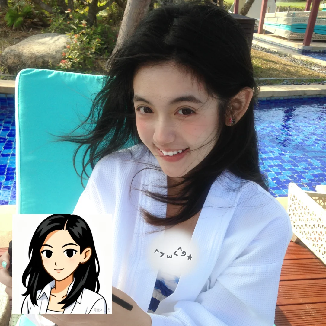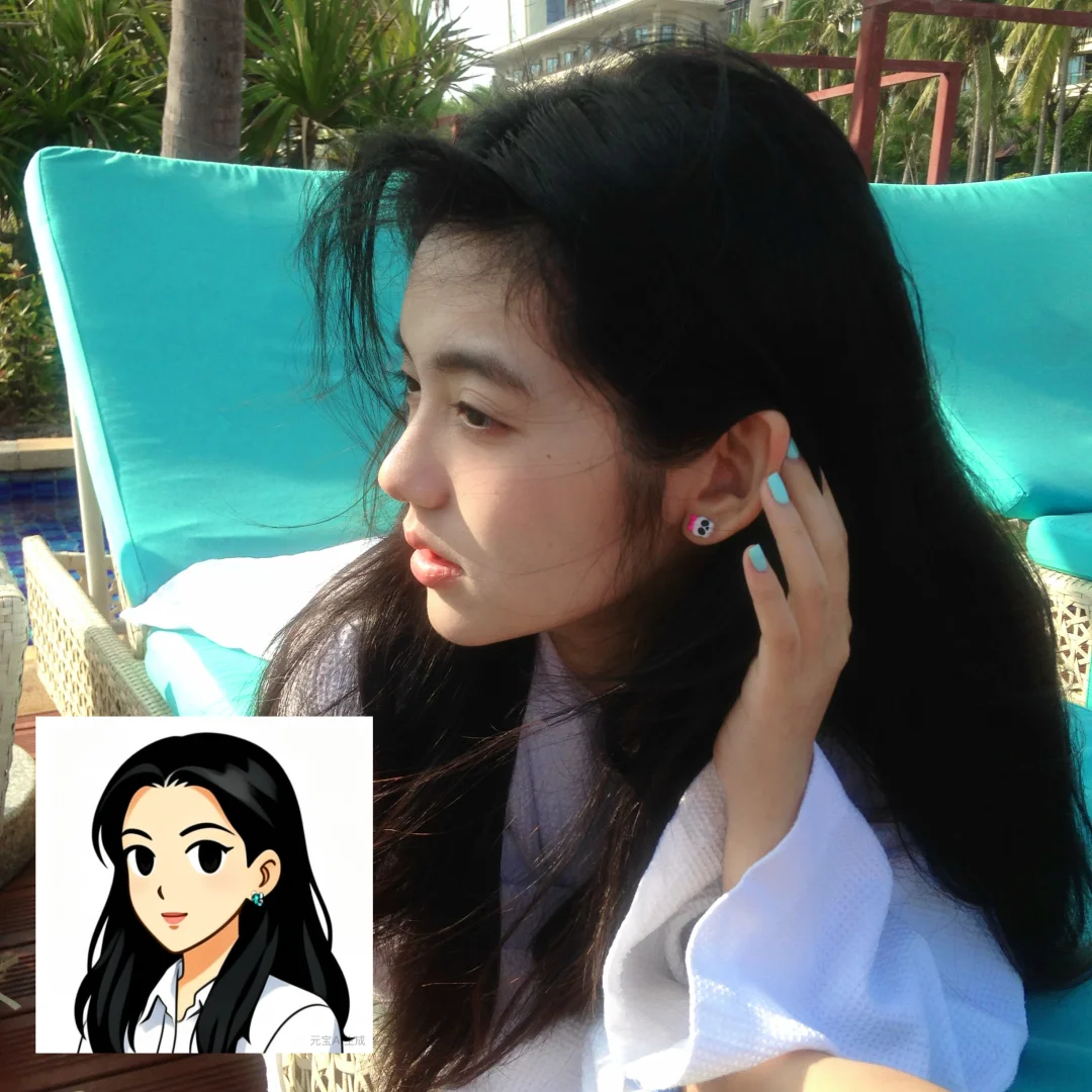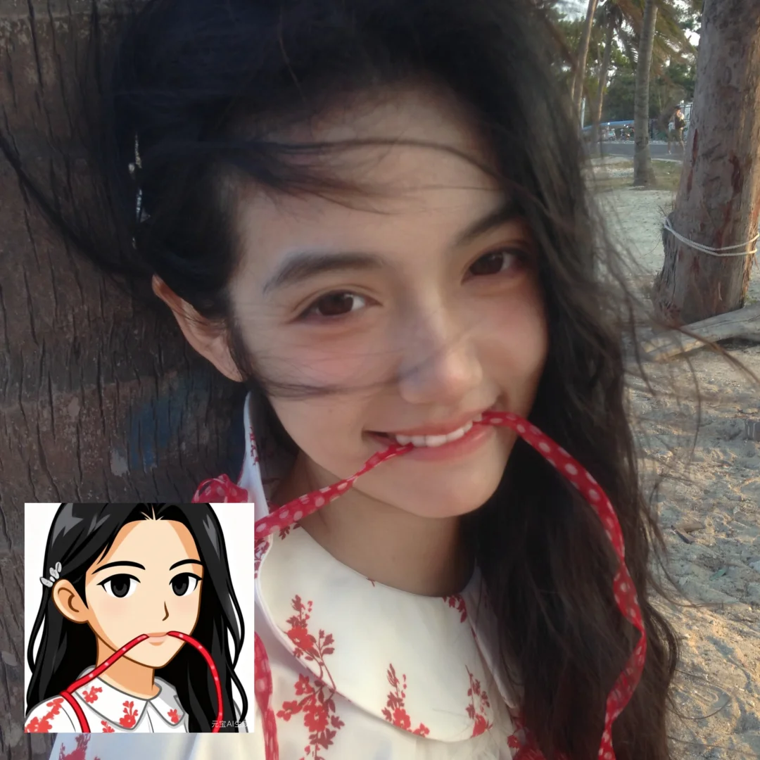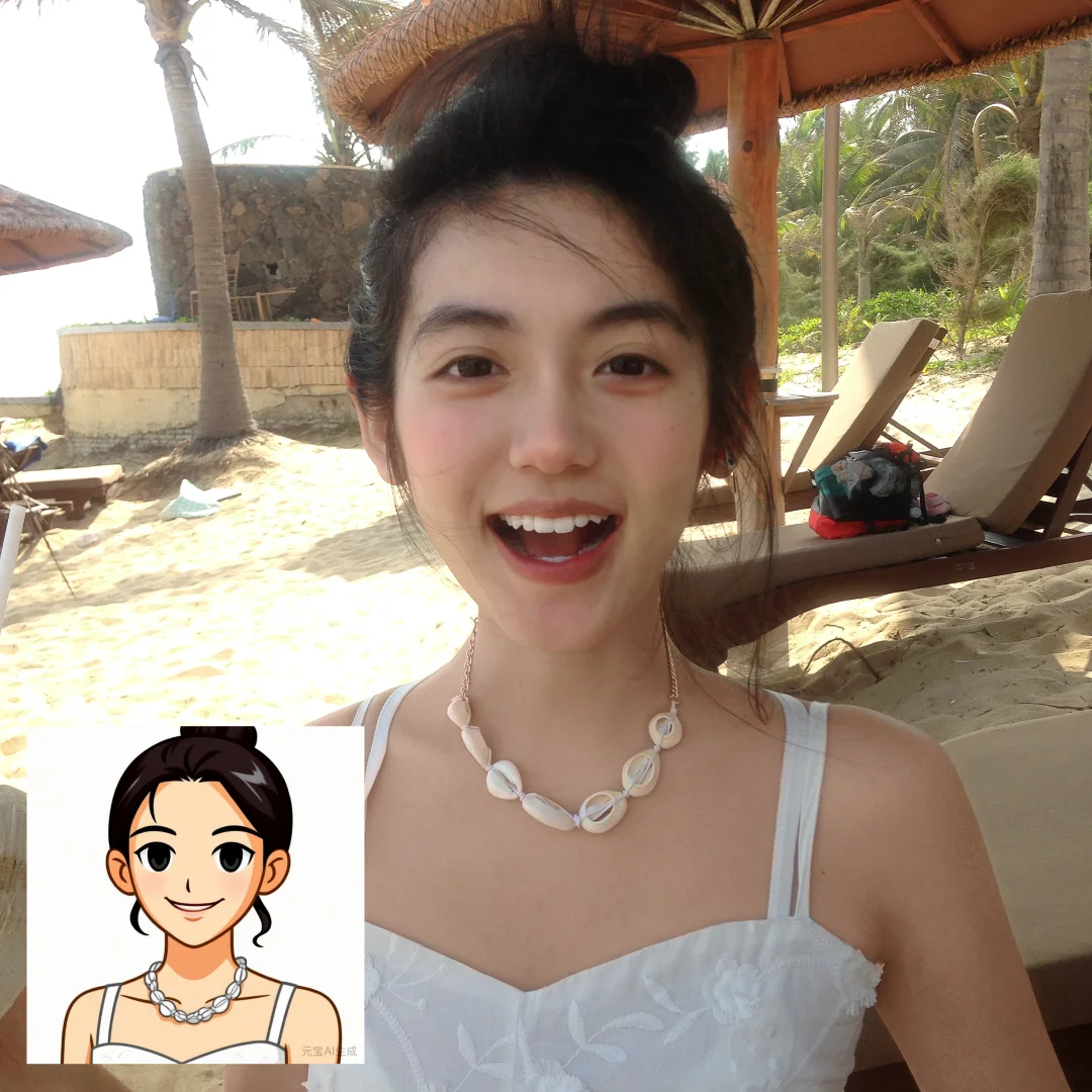 用元宝根据海边照片的风格生成的,操作超简单,上传照片就能一键出图,连细节都拿捏住了,头上的发夹、飘逸的发丝都融进头像里了~