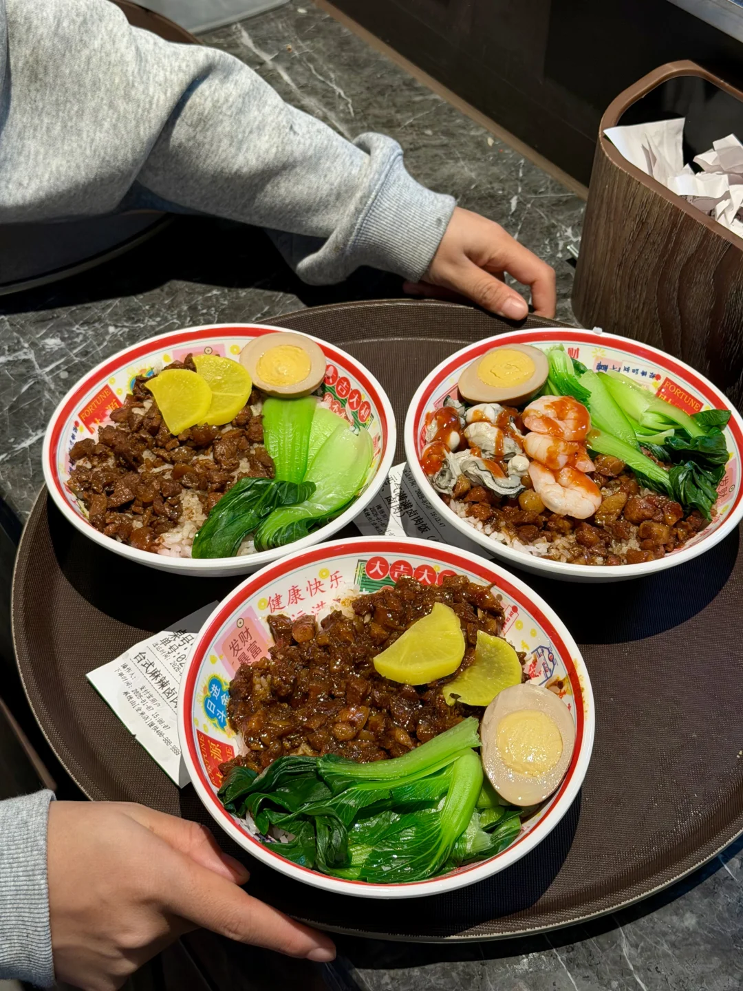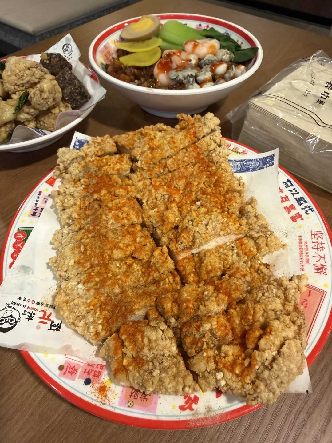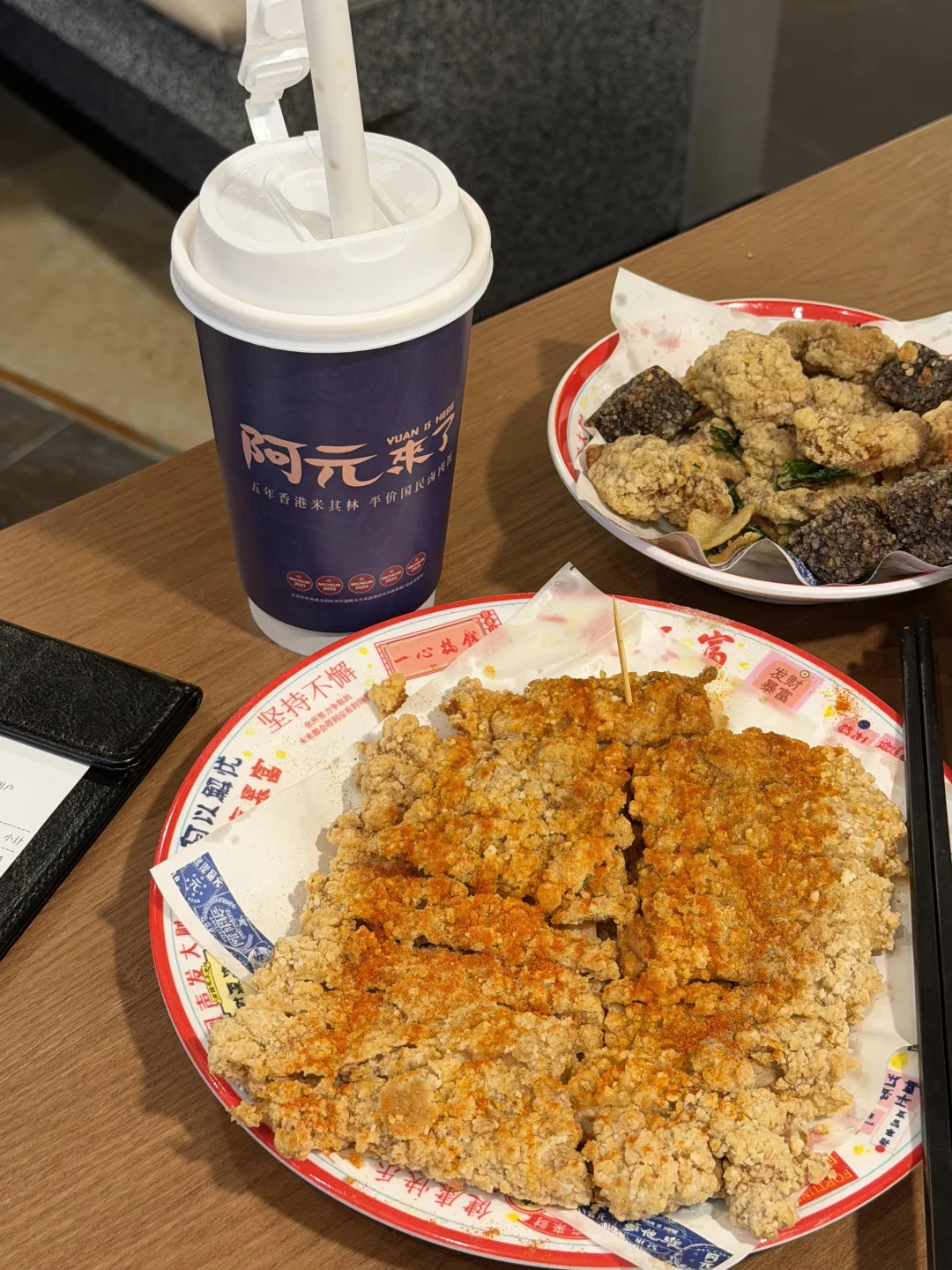 之前香港朋友安利过的阿元来了卤肉饭,连续几年的香港米其林,终于在成都吃到了啊啊啊!就在太古里B1新开的!!! 点了两碗卤肉饭,台式麻辣真的太合我这个成都胃了!一点也不腻!另一碗海鲜的比较偏甜口一点!还有一些经典的台湾美食,盐酥鸡和比脸还大的鸡排真的太过瘾了!!台式珍珠鲜奶茶很好喝,不甜,基本上人手一杯!!!缺点就是人多要排队😭😭!!