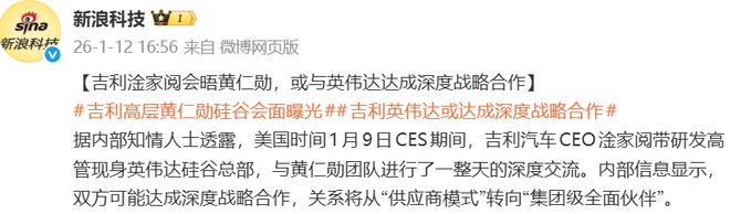 电动知家消息,2026年1月12日,据多家媒体报道,美国时间1月9日,CES期间,吉利汽车集团CEO淦家阅带领研发高管团队现身英伟达硅谷总部,与黄仁勋团队进行了长达一整天的闭门会谈。据内部知情人士透露,此次会面并非礼节性拜访,双方关系将从简单的“供应商模式”转向更深入的“集团级全面伙伴关系”。