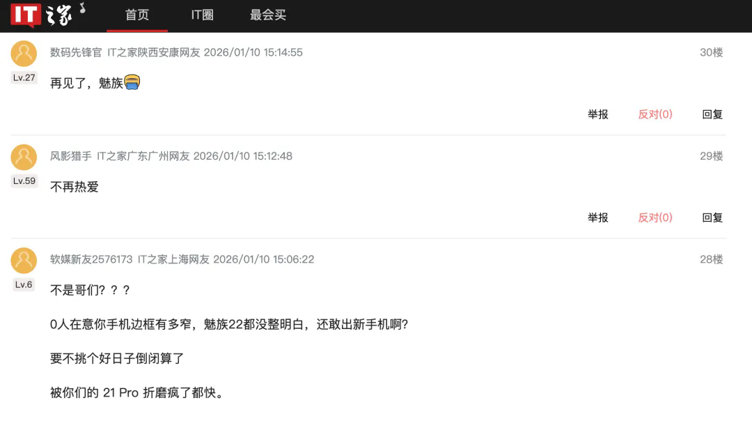 十数年前,魅族每次公布新机计划,都会引发海量“魅友”讨论。然而现如今,魅族23官宣后,不光鲜有“魅友”关注,甚至引得诸多网友唱衰。在IT之家发布的魅族23手机官宣新闻评论区,有网友表示,“0人在意你手机边框有多窄,魅族22都没整明白,还敢出新手机啊?要不挑个好日子倒闭算了。”