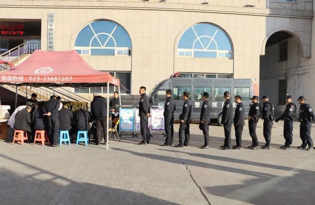 在杨凌示范区公安局大楼前,局机关和辖区民辅警列队填表、体检、献血,现场爱心涌动,温暖人心。