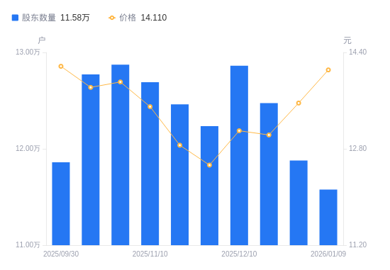 日期A股户数(户)流通A股户均持股数(股)户均持股市值(万元)2026-01-0911577910500.4014.822025-12-3111879210234.0713.882025-12-191247369746.3912.702025-12-101286249451.7812.382025-11-281223509936.4612.452025-11-201246209755.4612.552025-11-101269139579.2112.932025-10-311287329443.8513.142025-10-201277159519.0513.162025-09-3011859510251.0714.53