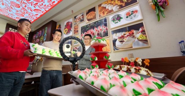孙吉勇(右一)和林家崖街道工作人员一起现场直播销售刚出炉的寿桃面点。西海新闻记者祁晓军摄