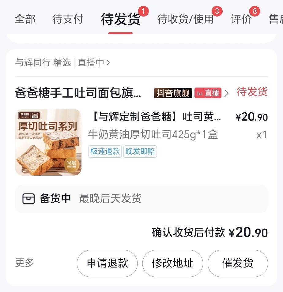 1月12日晚20点,今晚还蛮幸运的,在50万人同时开抢的“与辉同行直播间”里竟然抢到了一单定制吐司,而且还是在50万人抢3万库存的情况下抢到的,可见今晚的手速和网速都很给力! 朋友们,你今晚有去抢与辉同行的定制吐司吗?收获如何抢到没呢? 辉同行直播间