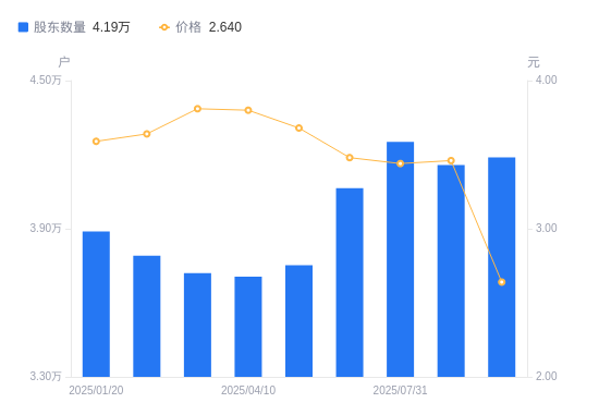 日期A股户数(户)流通A股户均持股数(股)户均持股市值(万元)2025-12-314188636521.949.642025-09-304158036790.7212.732025-07-314252335974.8412.382025-07-204064037641.6813.102025-06-303752640765.2815.002025-04-103706041277.8715.692025-03-313719841124.7415.672025-02-203790640356.6214.692025-01-203888939336.5214.122024-12-313866239567.4814.80