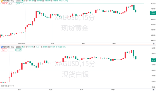 周一美盘,黄金一度涨超2%,并将历史记录刷新至4620美元上方,白银一度暴涨超7%。截止发稿前,二者均有所回落。