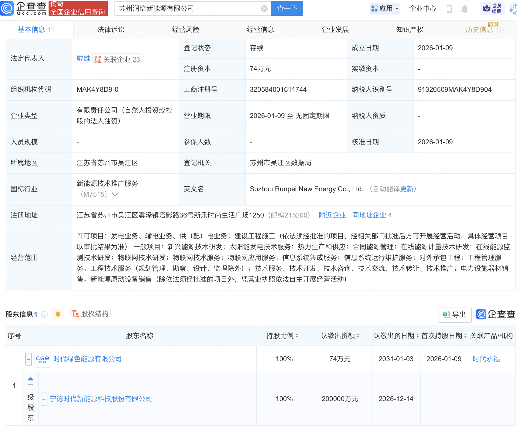 企查查APP显示,近日,重庆润开新能源有限公司、苏州润培新能源有限公司成立,法定代表人同为戴维,经营范围均包含:在线能源监测技术研发;物联网技术研发;物联网技术服务;物联网应用服务等。企查查股权穿透显示,二者皆由宁德时代(300750)间接全资持股。