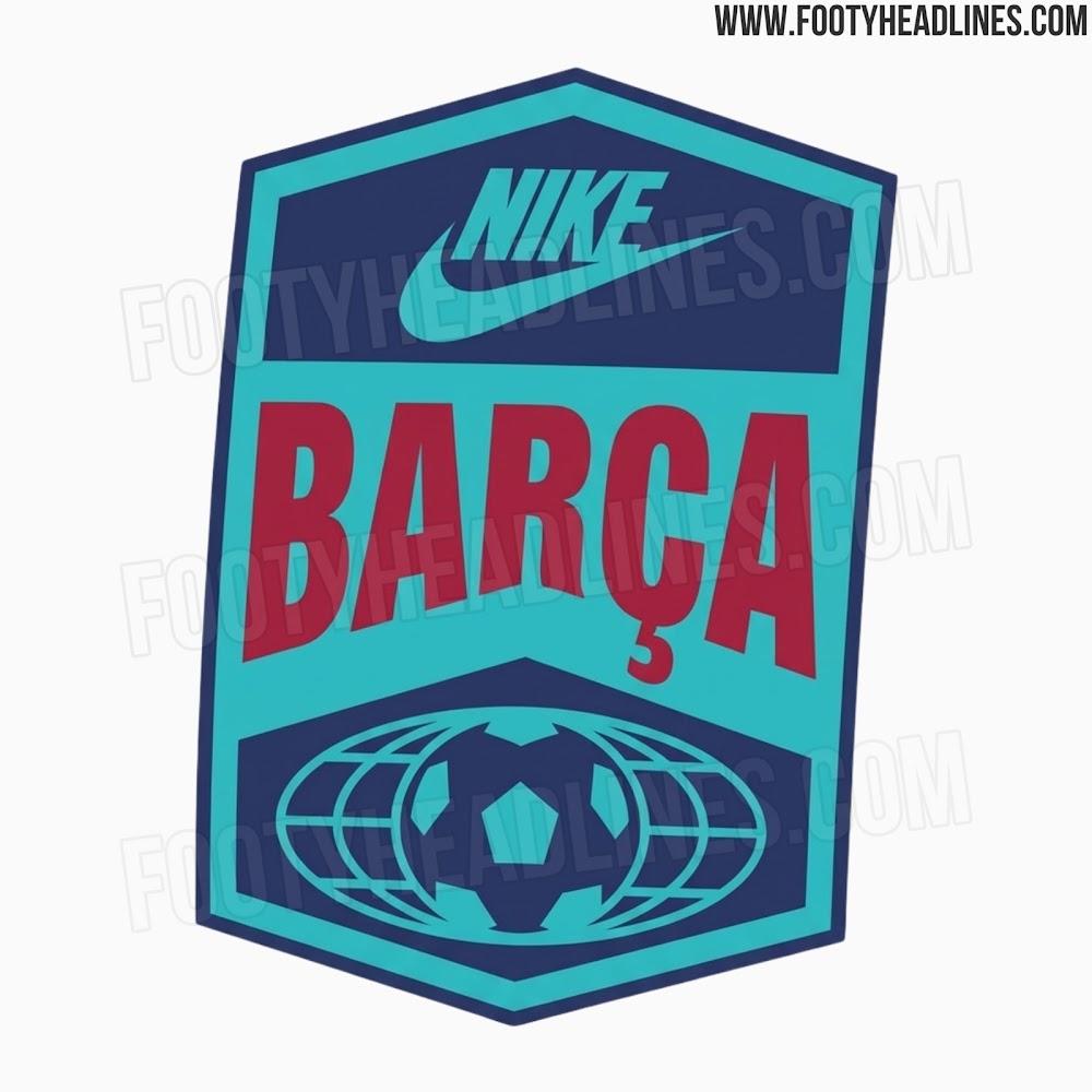 最新的第三球衣标志采用了与传统队徽完全不同的盾形设计。徽章以蓝绿色为底,搭配深蓝色边框和鲜红色字体,风格鲜明。标志最核心的部分是醒目的“BARÇA”字样,上方配有经典耐克Logo,下方为风格化的地球和足球图案,整体呈现强烈的运动复古美学。