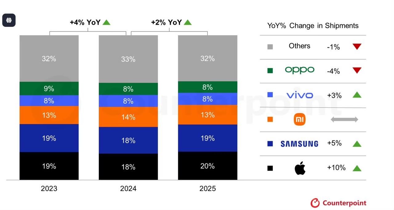 2025年度全球手机销量排行榜出炉: 苹果超越三星夺得第一,整体市场同比增长2% ①苹果,20%,同比增长10% ②三星,19%,同比增长5% ③小米,13%,持平 ④vivo,8%,同比增长3% ⑤OPPO,8%,同比下滑4%