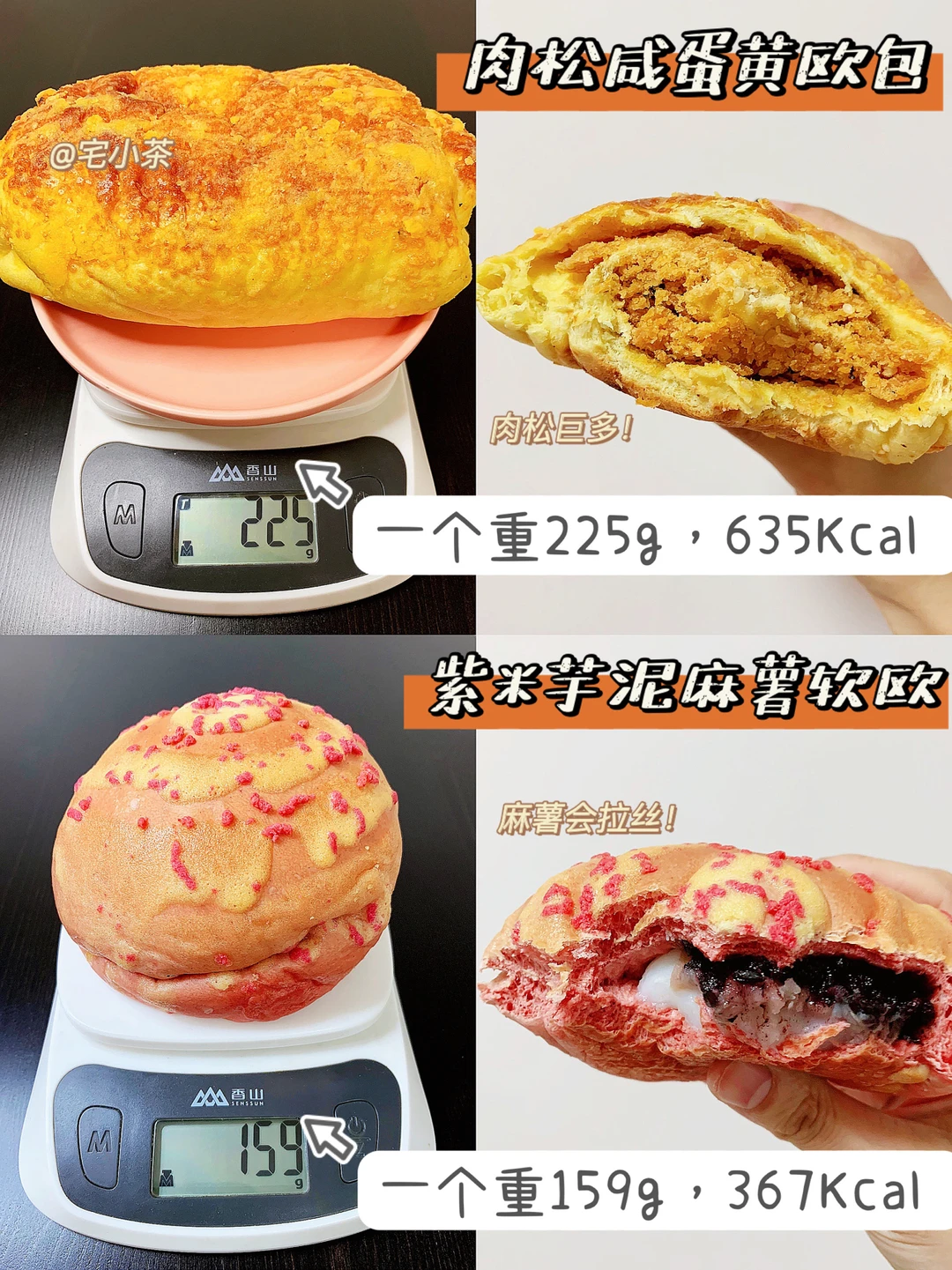 ➡️肉松咸蛋黄欧包:一个重225g,热量635Kcal