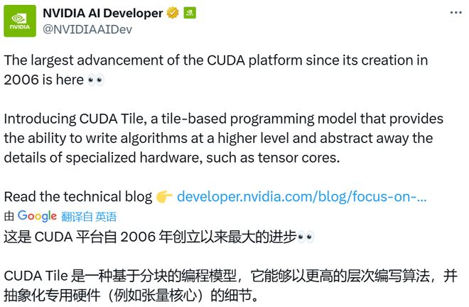事情是这样的,上个月初英伟达毫无征兆地推出了一个叫CUDATile的GPU编程语言,直接让圈里人炸锅了。因为官方是这么形容这次更新的,“这是自2006年CUDA发布以来,最大的一次进步”。