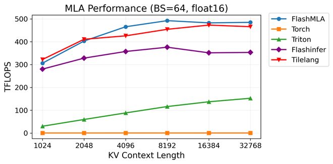 在H100显卡上,计算MLA算子,TileLang性能接近目前最快的FlashMLA