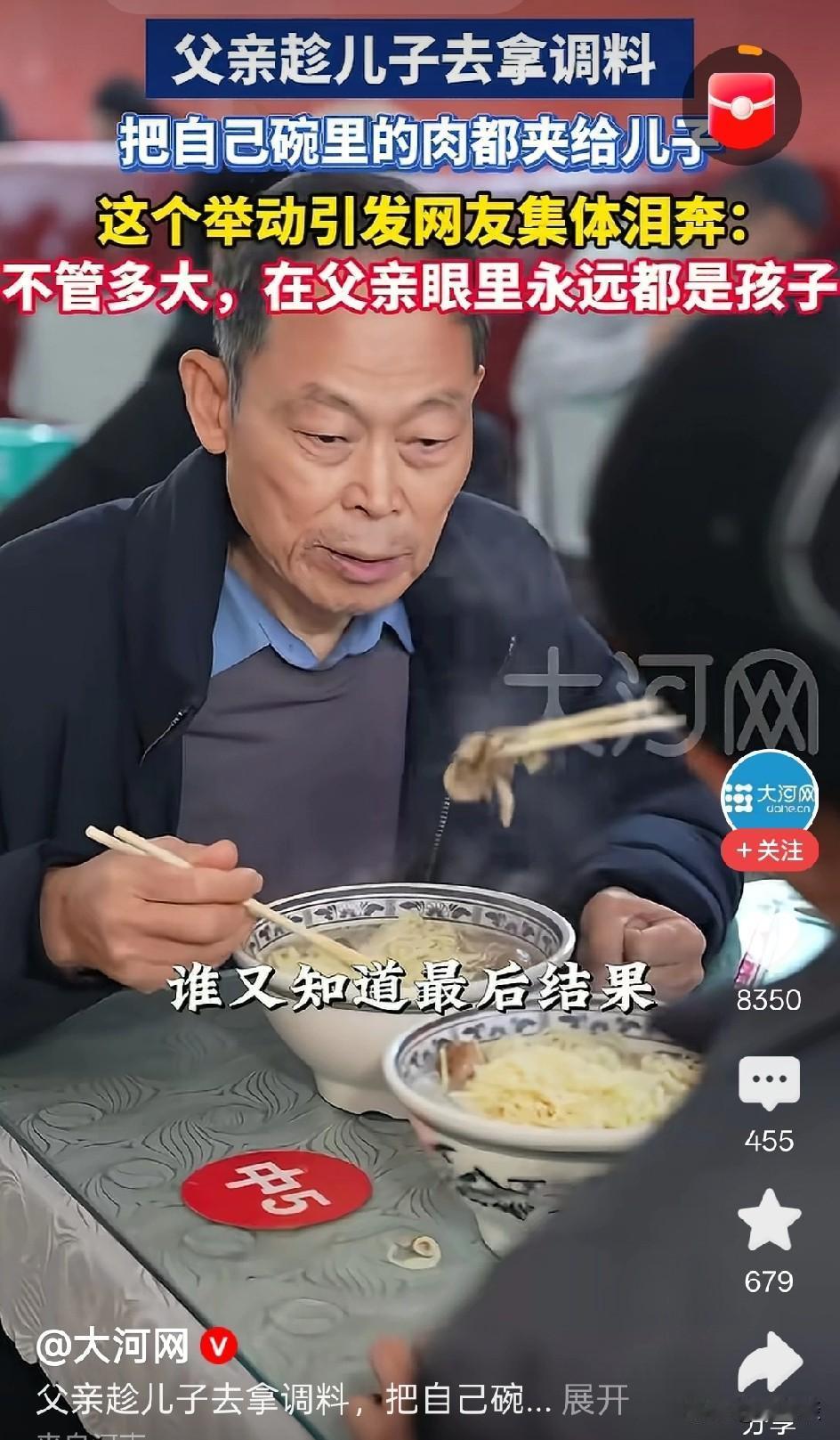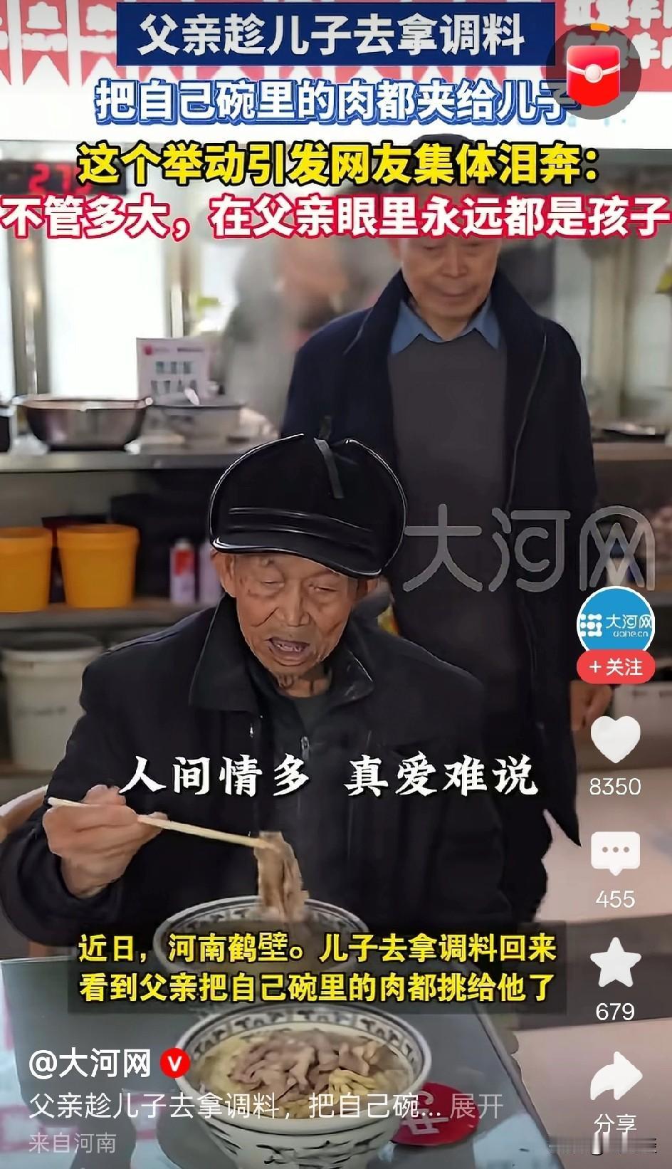 在父亲的眼里,无论儿女的年龄有多大,他永远都是个需要疼爱的孩子。看到一个视频,真的让人非常的感动:步入花甲之年的男子带着早已古稀之年的父亲来吃面条,给父亲的面条是肉面,而儿子的碗里是一碗素面。父亲趁着儿子去拿调料的功夫,哆哆嗦嗦把自己碗里的肉全部夹到儿子的面条里,并且用面条把肉盖住,生怕儿子看到。但这一切都在儿子的眼中,儿子看到后一句话都没有说。当他拿完调料后坐下来的时候,把自己的面条跟父亲的面条特意对换了一下,把那碗有肉的面条还是让给了父亲。只见父亲哆哆嗦嗦夹起两块大瘦肉,把肉伸到了儿子的口中。因为在父亲的眼中,只要有吃的,首先第一口想到的肯定是儿女,不管子女年龄多大。这就是父爱非常深沉的父爱!