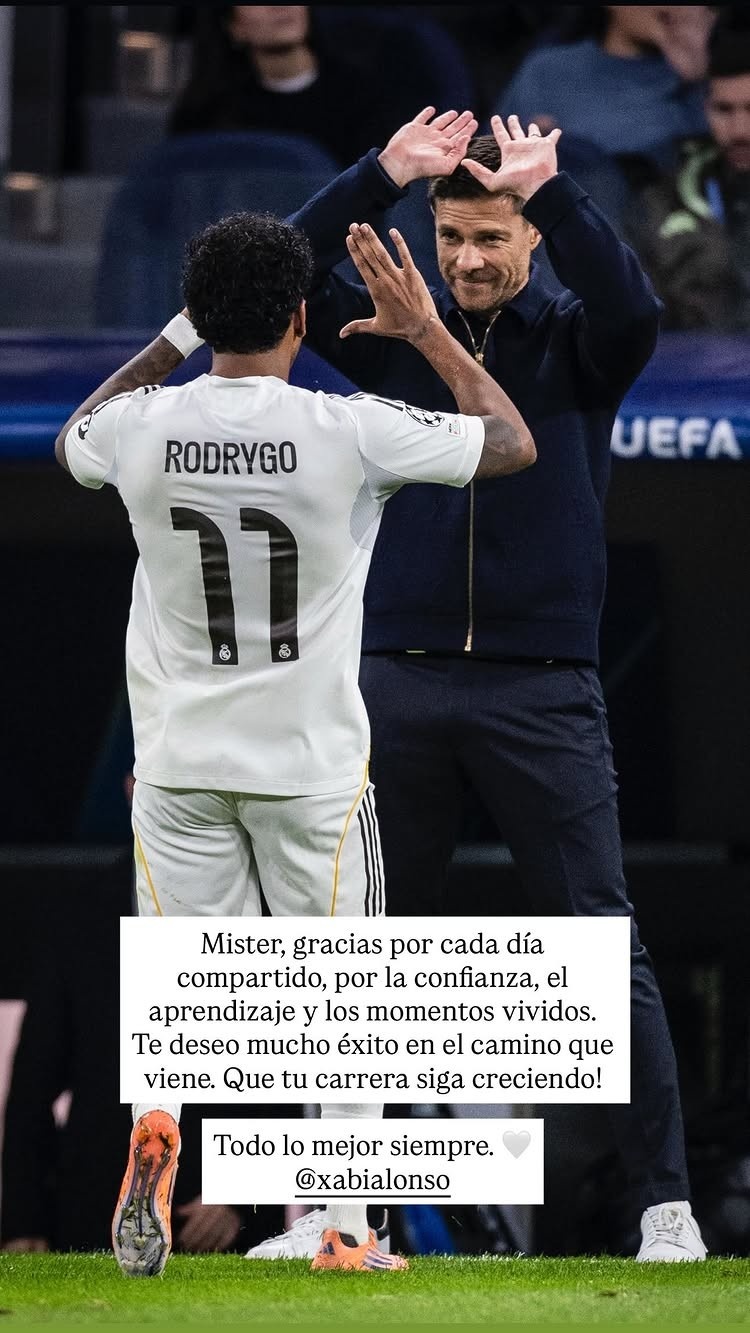 罗德里戈晒出自己同阿隆索的击掌照,并配文:“先生,感谢您与我们共度的每一天,感谢您的信任、理解和我们共同经历的时刻。祝您在未来取得很多成功。祝您的职业生涯继续进步!祝您一切顺利!@哈维·阿隆索”
