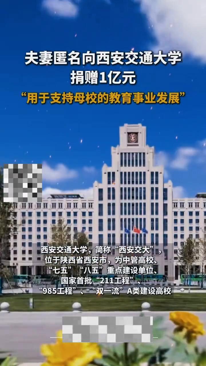 夫妻匿名向西安交通大学捐赠1亿元,"用于支持母校的教育事业发展"。 俪俪。 1月10日,据西安交通大学发文:西安交通大学校友伉俪怀揣着对母校深沉的爱,匿名慷慨捐赠1亿元,为百卅交大的奋进之路注入温暖而磅礴的力量。 西安交通大学简称"西安交大",位于陕西省西安市,为中管高校、"七五"、"八五"重点建设单位、国家首批"211工程"、"985工程"、"双一流"A类建设高校。