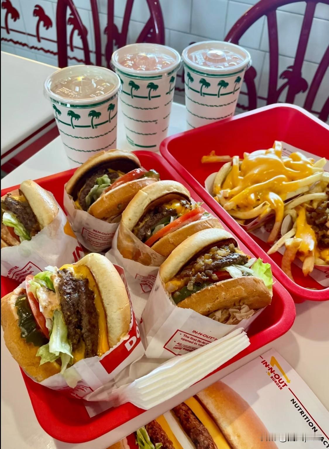美国加州特产In n out汉堡,味道很好,而且搭配很健康啊,有两片厚实的牛肉饼,有西红柿、青菜、洋葱,还有面包,中间放奶酪片,浇上秘制酱汁。只卖6、7美元一个。吃一个,能顶两顿饭。 以前有人说,洋快餐是垃圾食品。但吃了很多之后,发现这种汉堡营养搭配很全。有碳水化合物,有精选的牛肉饼,还有蔬菜。这种牛肉饼很软,也不会塞牙。