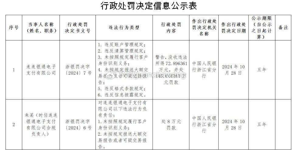 事实上,这种“合规黑洞”并非无迹可循。天眼查App显示,2024年11月,中国人民银行浙江省分行的一纸罚单,精准击中了连连支付的软肋。高达518.54万元的罚没款,揭露了其在账户管理、客户身份识别以及可疑交易报告等六大方面的严重违规。尤其是“未履行客户身份识别义务”与“未报送可疑交易报告”这两项指控,恰恰是“分期商城”乱象可能滋生的温床。连连支付被开出百万级别罚单的同时,相关责任人也获得相应处罚。从罚单来看,连连支付4名相关负责人对相关违法行为负有责任,合计被罚30万元。