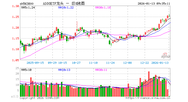 1月13日,A500ETF龙头(563800)开盘跌0.08%,报1.253元。A500ETF龙头(563800)重仓股方面,宁德时代开盘涨1.26%,贵州茅台涨0.25%,中国平安涨0.37%,招商银行涨0.19%,紫金矿业涨0.38%,新易盛跌1.56%,中际旭创跌1.89%,美的集团跌0.92%,东方财富涨1.00%,长江电力涨0.18%。