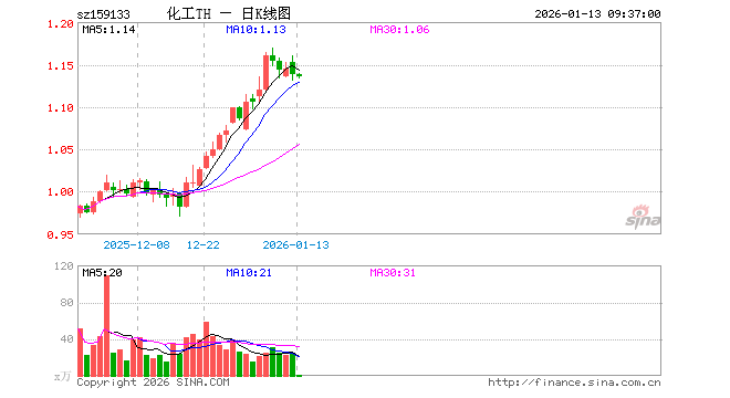 1月13日,化工ETF天弘(159133)开盘涨0.00%,报1.138元。化工ETF天弘(159133)重仓股方面,万华化学开盘跌0.08%,盐湖股份涨1.38%,天赐材料涨0.05%,巨化股份跌0.49%,藏格矿业涨0.08%,多氟多涨0.00%,云天化涨0.65%,恒力石化涨0.04%,华鲁恒升跌0.77%,宝丰能源涨0.67%。