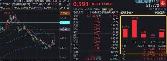 13日早盘,港股接力高开,互联网龙头集体走强,阿里巴巴-W涨超5%,哔哩哔哩-W涨超4%,快手-W涨逾3%,腾讯控股涨超2%,小米集团-W涨逾1%。港股AI核心工具——港股互联网ETF(513770)场内价格续涨逾4%。近期持续受资金关注,上交所数据显示,港股互联网ETF(513770)近10日累计获资金净流入7.45亿元。
