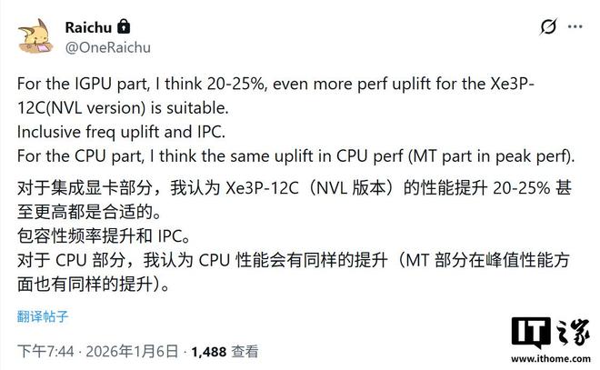 IT之家1月13日消息,消息源@OneRaichu于1月6日在X平台发布推文,称英特尔NovaLake处理器将搭载Xe3P架构核显,性能预估比PantherLake的Xe3架构提升20~25%。