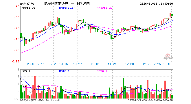 1月13日,截止午间收盘,物联网ETF华夏(516260)跌1.58%,报1.310元,成交额102.08万元。物联网ETF华夏(516260)重仓股方面,中际旭创截止午盘跌0.68%,立讯精密跌0.63%,汇川技术跌2.12%,中兴通讯跌3.53%,兆易创新跌1.63%,豪威集团跌2.73%,科大讯飞涨4.43%,海康威视跌1.64%,美的集团跌2.02%,海尔智家跌0.15%。